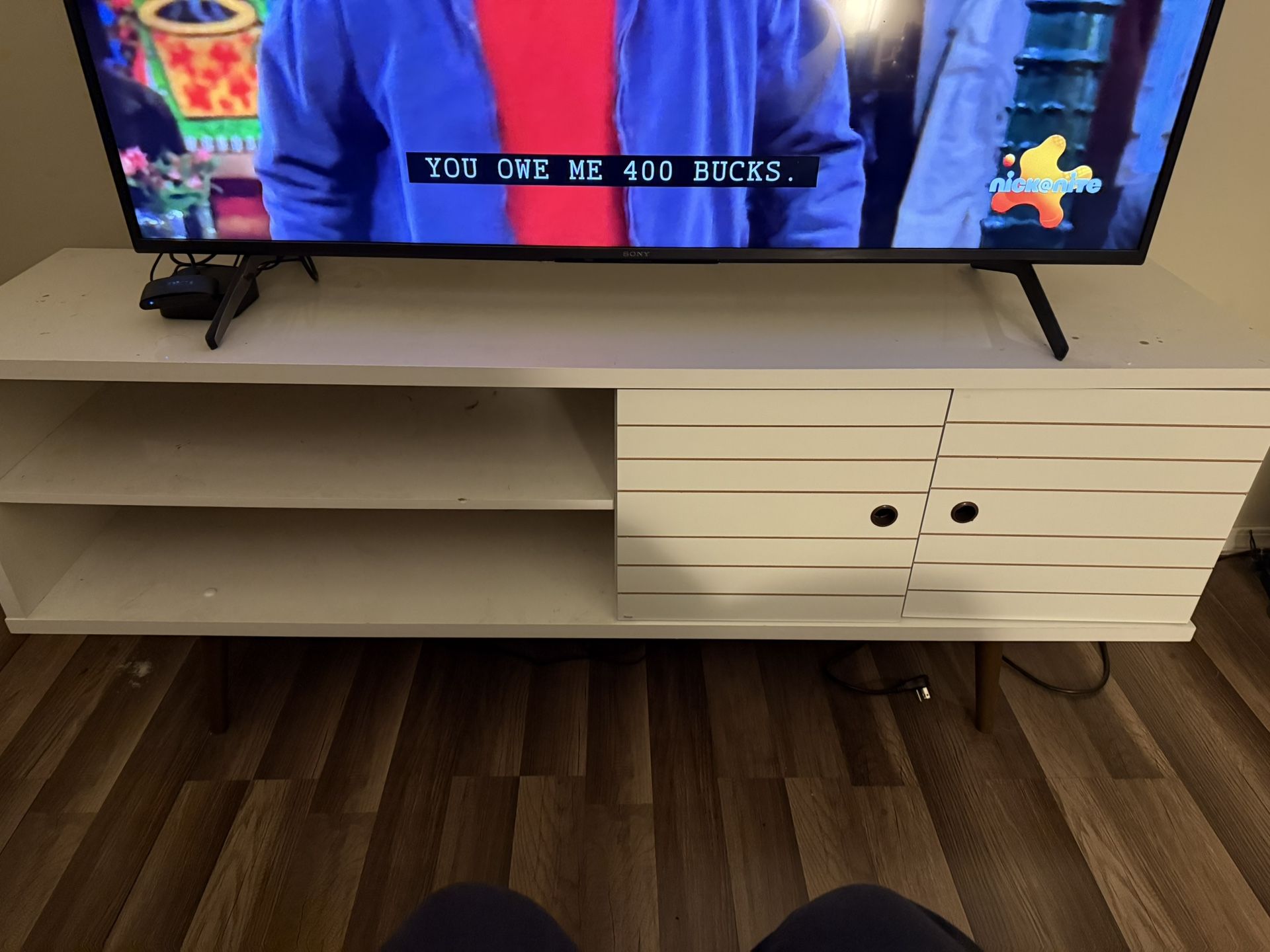 Normal wear and tear. Very sturdy. Fits up to 65” television. 63”W , 15.5”D, 25.5H.
