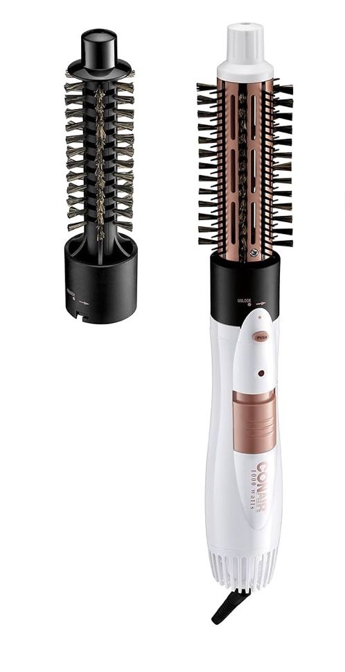 New without box Brand Conair Color White Material Ceramic Wattage 1000 watts Power Source Corded Electric Special Feature dry, style, hot Hot Air Brush Combo Kit: With 1000 watts of power, this hot air brush features a 1¼ inch thermal brush to curl or straighten, a ¾ inch nylon plus boar and bristle brush to curl for silky-straight results. Advanced Design: This styling kit features Double Ceramic technology which delivers even heat, fast styling, and long-lasting results - plus 2 speed settings and cool tip for easy handling. Dry and Style with One Tool: For smoothing and volumizing, turn to a hot air brush, great for drying and styling damp hair for that perfect at-home blowout or refreshing your hair between washes after applying your favorite dry shampoo. Innovative Styling: From curling irons and wands to flat irons, hot air brushes, straightening brushes, auto curlers and more, we make high quality styling tools for all hair types. Conair Hair Care: Since 1959, we have made innovative small appliances, hair styling tools, and more; Our hair care line includes high quality hair dryers, brushes, styling tools, and hair accessories.
