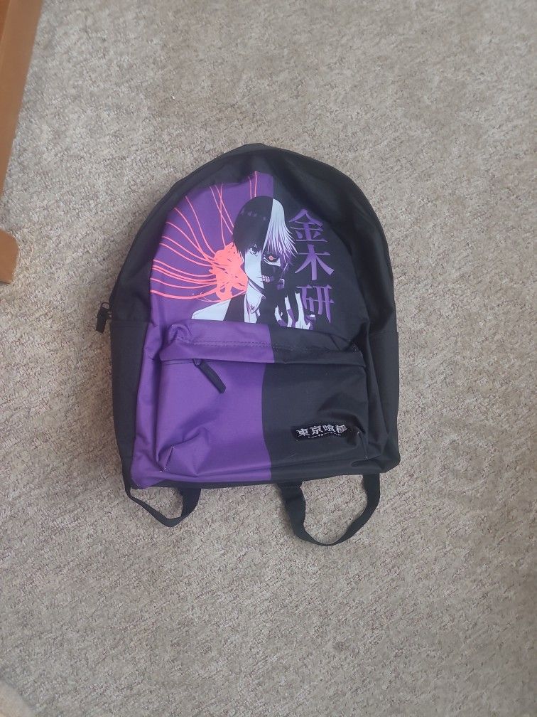 Tokyo Ghoul backpack with kaneki on the front, it's split colored. It's a fairly decent sized backpack and it's only been used once it was just too big for what I was looking for.