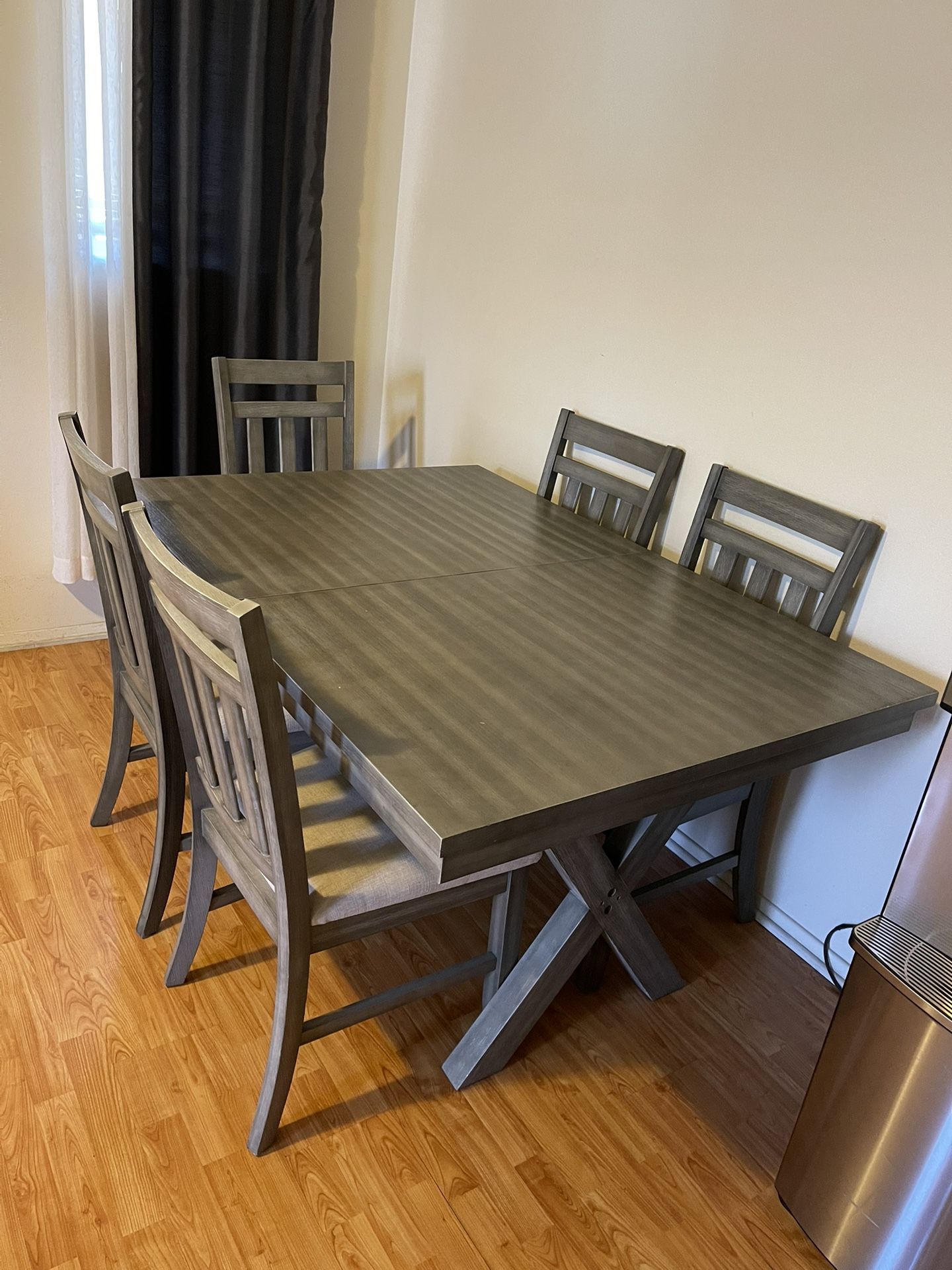 Beautiful dining table set with 6 matching chairs. The table is in good condition with minimal use. It also has an extendable design, so you can easily make it bigger when needed.