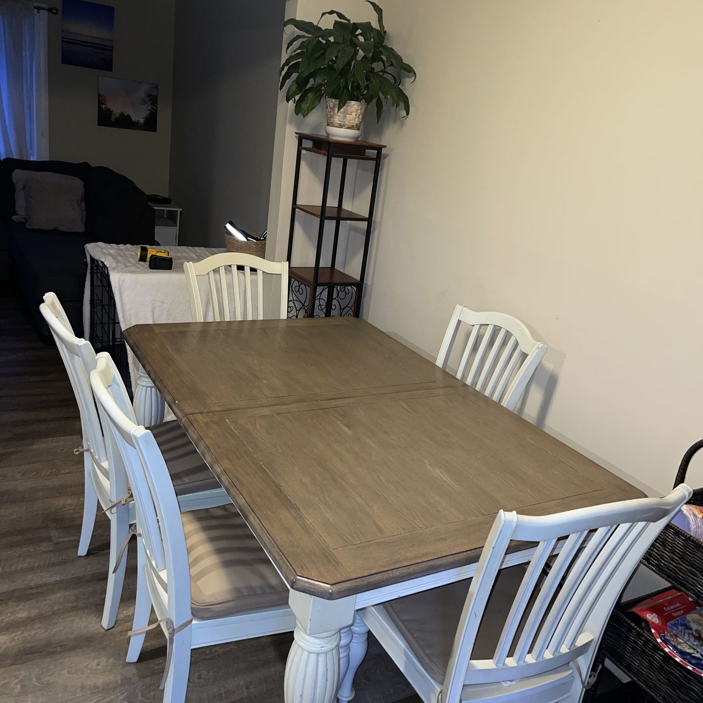 Great condition. Moving and would hate to throw it away. Comes with additional piece for middle. With 6 chairs and new cushions