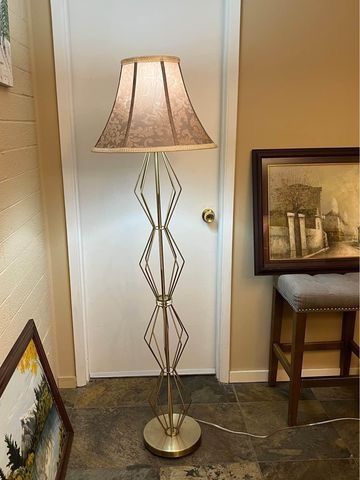 Item: Modern Brass Floor Lamp with Fabric Shade Description: Elegant brass floor lamp with a geometric base design and a soft fabric shade featuring a subtle floral pattern. This lamp adds a touch of sophistication and ambient lighting to any space, perfect for living rooms, bedrooms, or reading nooks. • Condition: Excellent • Material: Brass base with fabric shade • Style: Modern geometric design with vintage-inspired accents Dimension- H 5.5’ Additional Info: From a pet-free, smoke-free home. Message for more details or to arrange a viewing!