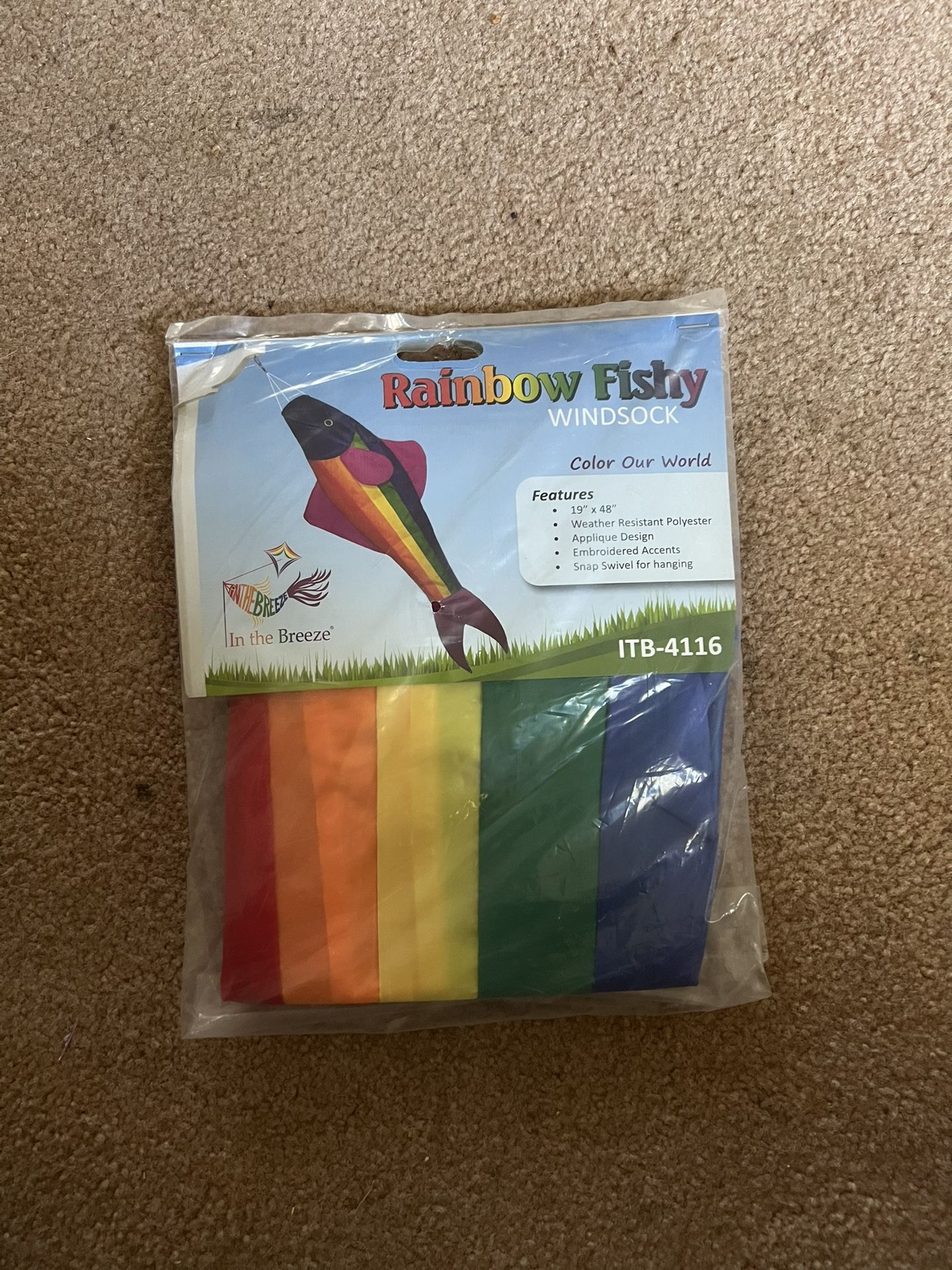 Brand New Rainbow Fishy Windsock. 19” x 48”. Snap Swivel for hanging. Embroidered Accents. Appliqué Design. Weather Resistant Polyester. Beautiful Rainbow Colors. Bag never opened. No Shipping. Cash Only