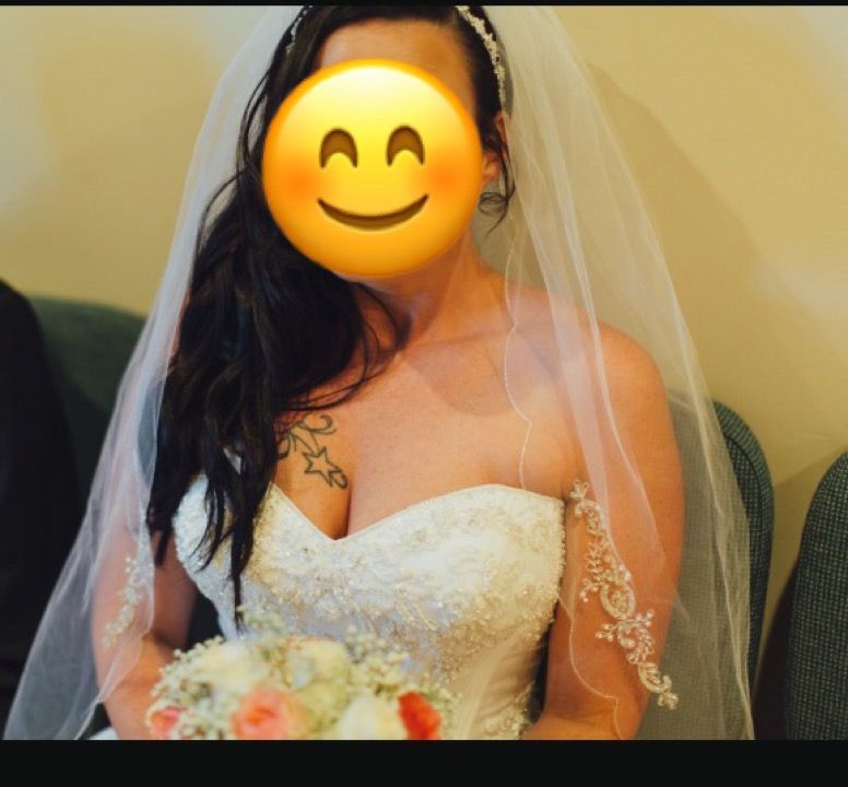 Worn for 30 mins during ceremony. Bought for $200 at David's Bridal. Bead design goes all the way around the veil. 34 inches long.