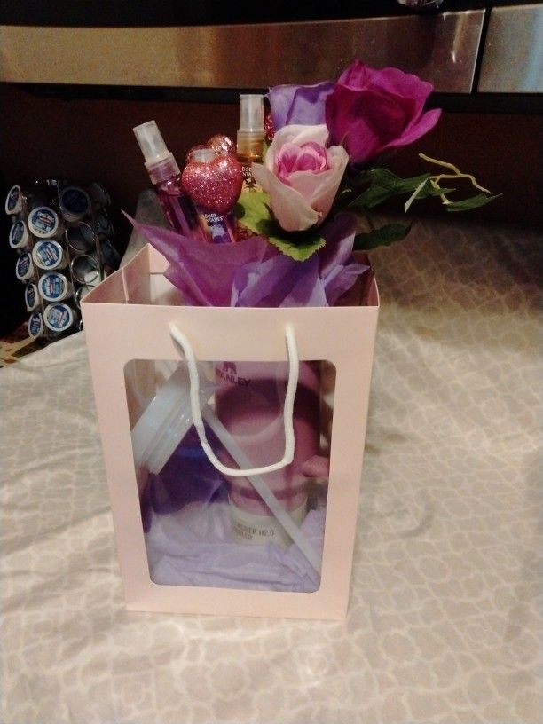 Genuine Stanley cup with 3 body mists , heart decor and faux roses.