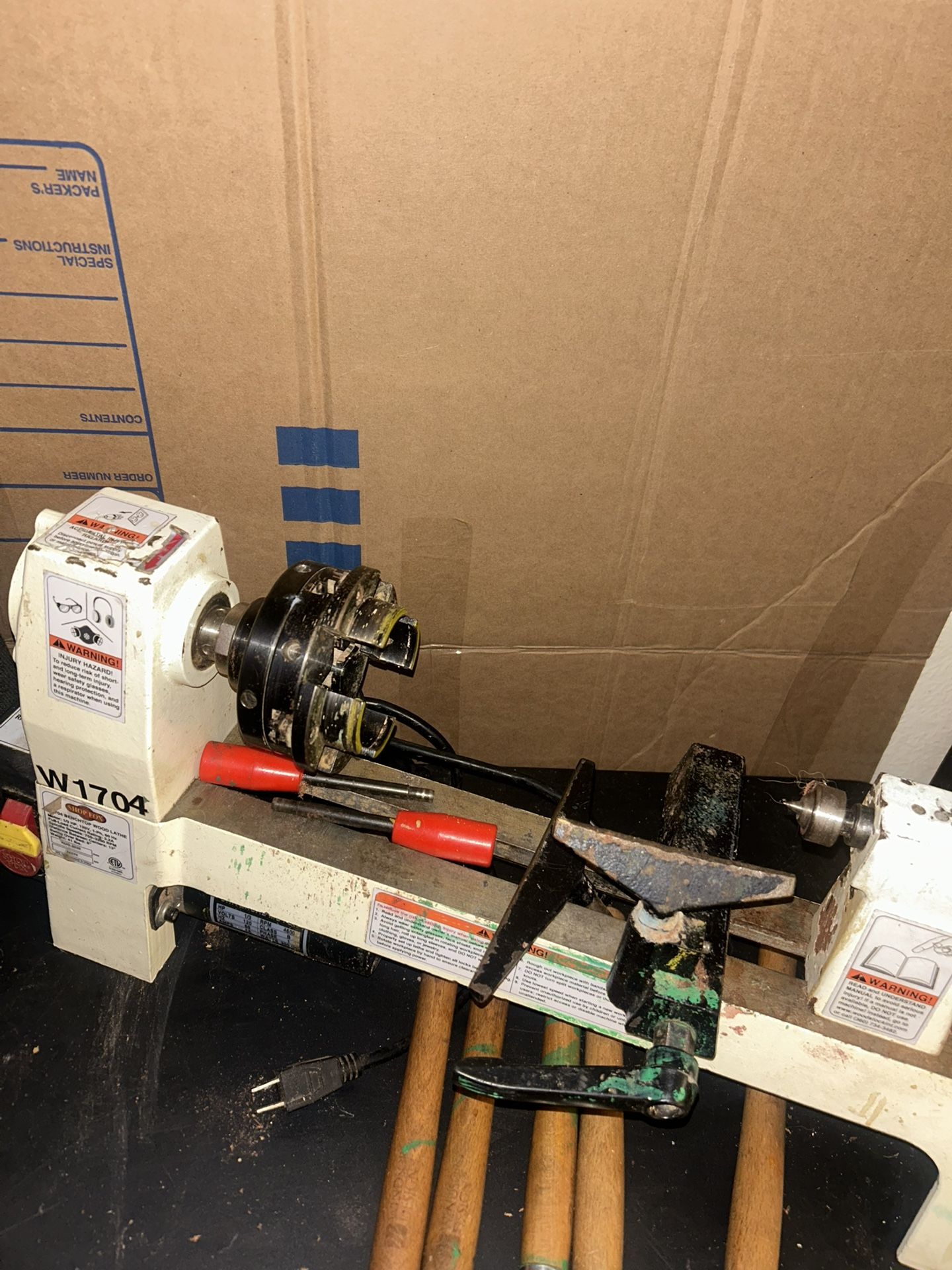 Cast iron. Work area 8inx13in. Tabletop lathe comes with 3in adjustable chuck and gouge set. Used. Asking $150. Can negotiate on amount for pick up only.
