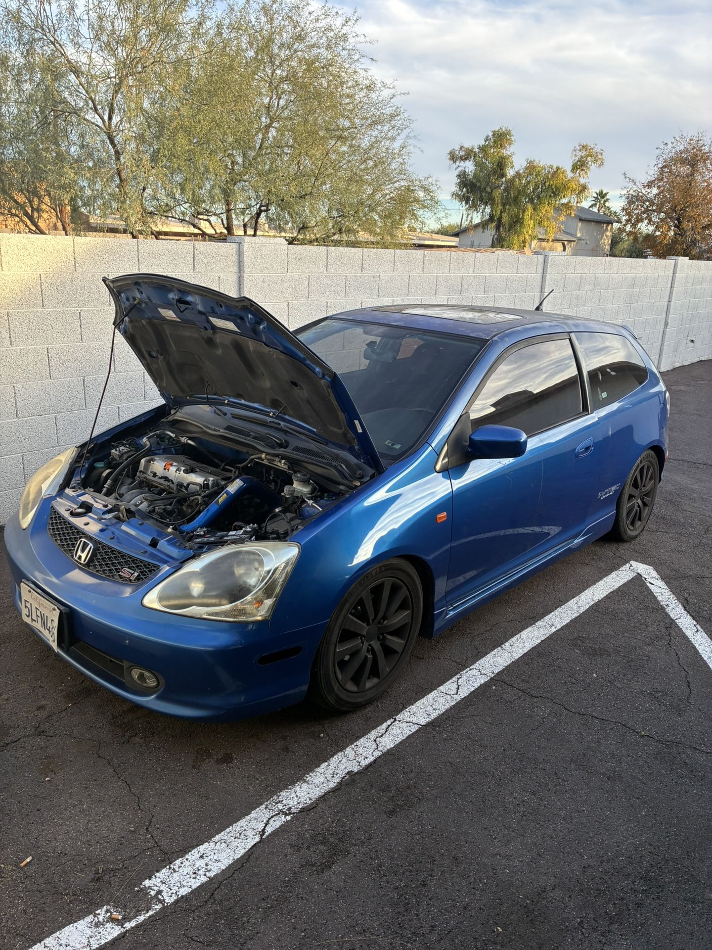 Hello I have a a 2005 EP3 si. Car runs and drives good. It’s my daily driver. Car starter is going faulty which is a cheap fix. Car also needs crankshaft position sensor. Engine light is on due to evap. Can be something simple as replacing gas cap. Just don’t have time to work on it because I travel a lot for work. Car has tax type a transmission. That makes it a six speed. All stock except arm intake. Car is registered I California on a non op due to not getting smog. Asking $4,300. Or shoot me an offer. Really good car here decent interior Si. I also have a brand new set of coilovers ( front and rear)