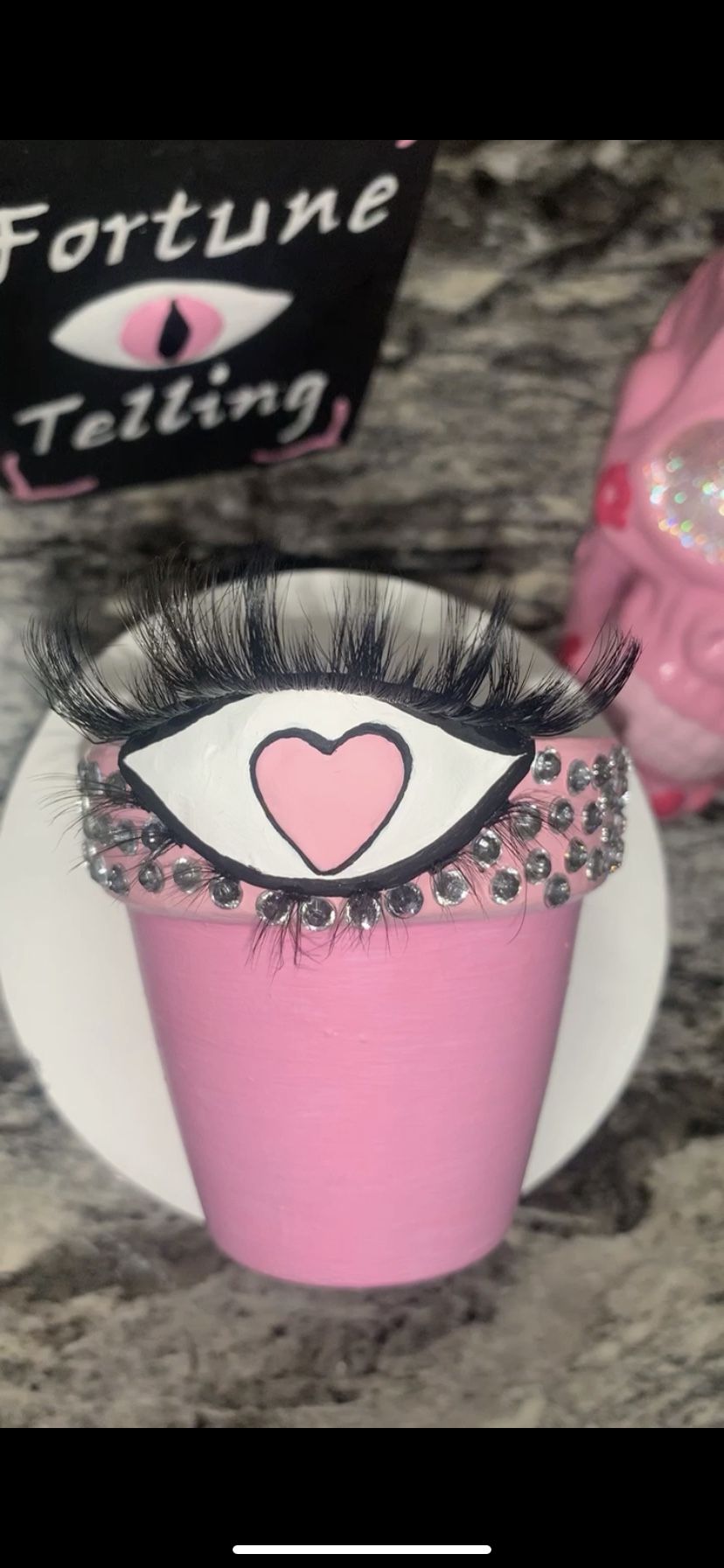The Heart Eye plant pot is a fake plant pot that measure 2.5 length, 2.5 width, and 3.69 height. I can make to order so you’re able to pick color, rhinestone size, and eyelash style.