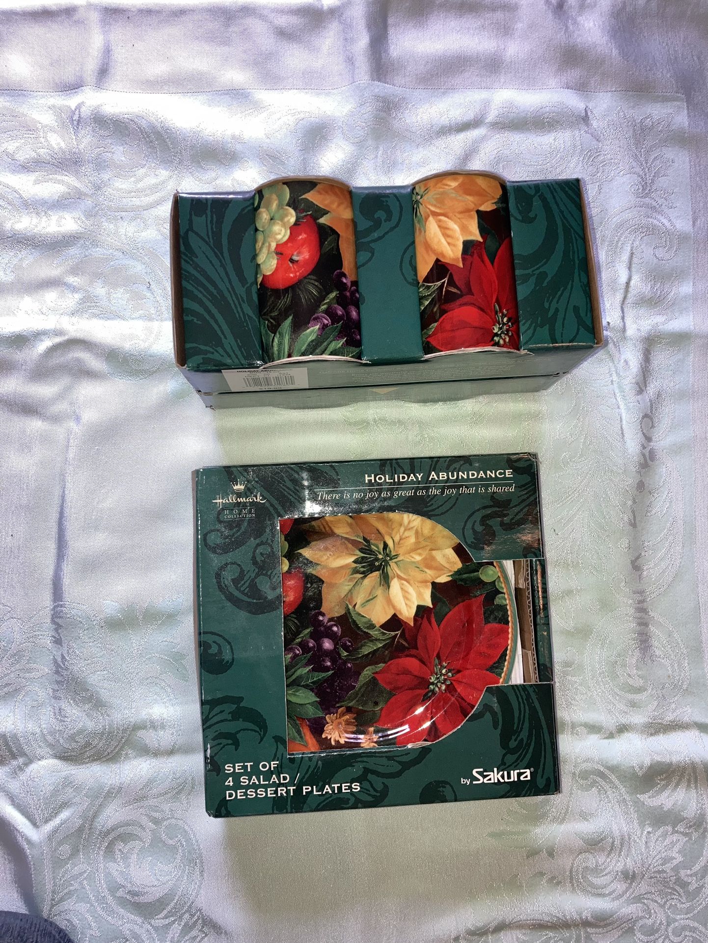 Dessert plates 4pk, Mugs 4pk, 18 x 13” placemats, 18 x 18” cloth napkins, and a 70” round tablecloth. Hallmark Home Collection poinsettia. Holiday Abundance pattern by Sakura. Poinsettias and fruit. Perfect addition to any Christmas dinner table. Stoneware. Durable for every day use. microwave and dishwasher safe. Multiples. NEW. Will separate. 4pk dessert plates 5 pkgs- $10 each pack 4pk coffee mugs 5 pkgs- $10 each pack 18x13” placemats. Total 10. $3 each 18 x 18” cloth napkins, Total 10. $1 each. 70” round cloth tablecloth. $10 All in excellent condition. $150 for all. Pick up in Glendale Heights. Check out my other posts please for more Christmas ornaments, tableware and decor
