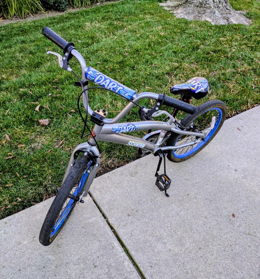 Schwinn Dart 20" BMX bike. Silver frame with blue wheel rims. Condition: Used, needs a new air tube in front tire. Rides and brakes well.