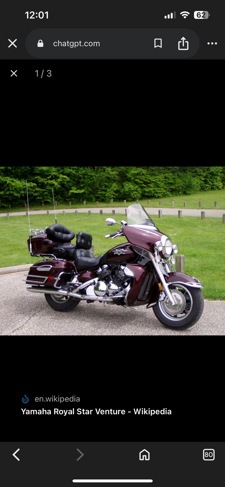 Yamaha Royal Star Venture – V4 Touring Motorcycle – Runs Great Description: For sale is a Yamaha Royal Star Venture (XVZ1300) full-dress touring motorcycle. • 1294cc V4 engine • Smooth, powerful, and extremely comfortable for long rides • Hard saddlebags & rear trunk • Cruise control • Floorboards • Shaft drive • Clean title in hand • Starts right up and runs strong Bike is in very good condition for its age. Paint looks great, chrome shines, and tires are in good shape. Perfect bike for cruising or road trips. No trades. Serious buyers only. Message me with questions or to come see it.