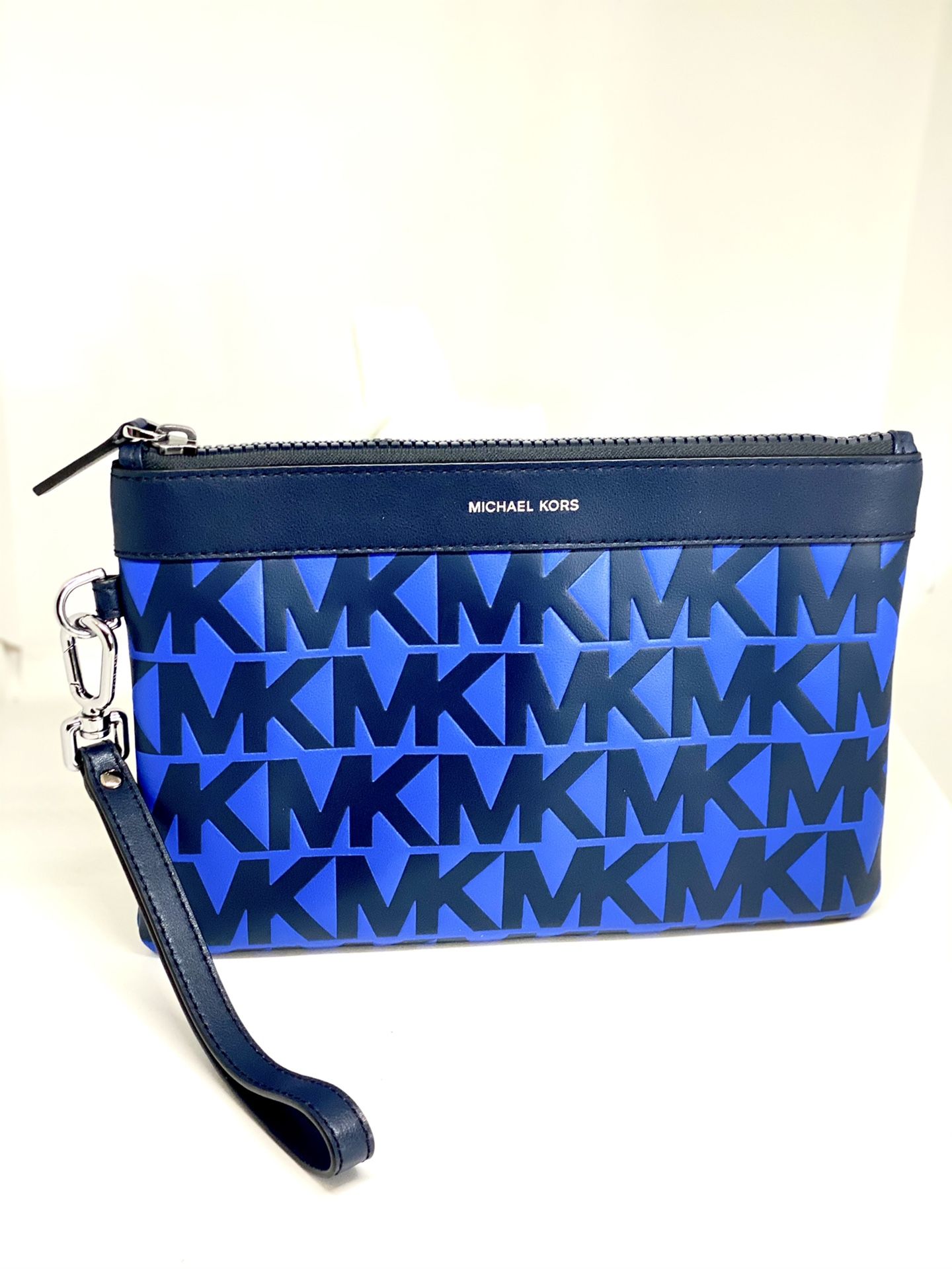 MICHAEL KORSš„NWOTš„Large Zip Clutch Wristlet Beautiful! Being well kept and new conditions. Photo shows itās brand new beauty. Approximate Measurements: 11āL x 1āW x 8āH Colors: Blue/Black Materials: Leather Silver tone hardware Removable wristlet strap Black fabric lining (2) slip pockets Questions are welcomed. Thank you for stopping by again.
