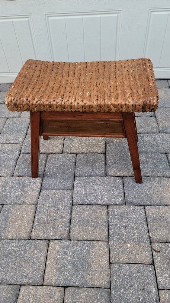 Wicker Vanity Seat/Bench. Wicker weave top with wooden legs. Seat is 18in from floor and measures 21inches across by 12inches deep. In good condition with some light wear. Nice addition to your bathroom vanity or to a makeup table. Can also be used as a foot pedestal/table. $20 obo. Make an offer!