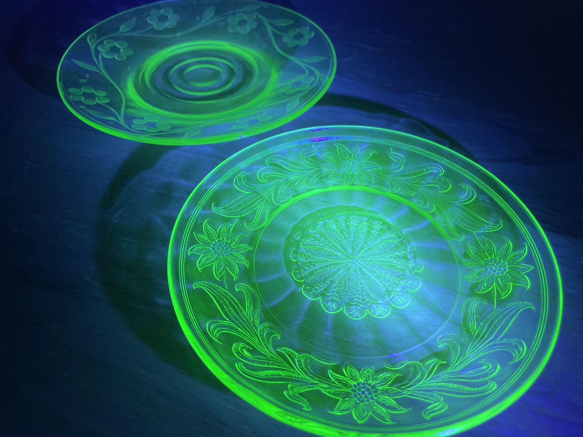 2 Vintage Uranium Green Depression Glass Floral Flower Etched Plates These beautiful plates are both in good condition; no chips, no cracks. Price is for the pair. They were both made in the depression era during the 1930s. The detailed and intricately etched plate is in the Sunflower pattern made by Jeanette Glass. I am unfamiliar with the pattern of the other plate. They would look stunning included in a collection of UV reactive or glowing glass. They would also complement a mid century modern (MCM), art deco, art nouveau, cottage core, farmhouse, country, depression era, vintage or antique styled home. 📍Location - pick up by Craig and Decatur in North Las Vegas 89130 💵 Payment - cash only Feel free to take a look at my other uranium, cadmium, selenium and manganese glass for sale. Follow my page for first look at new vintage and antique items being posted. Thank you!