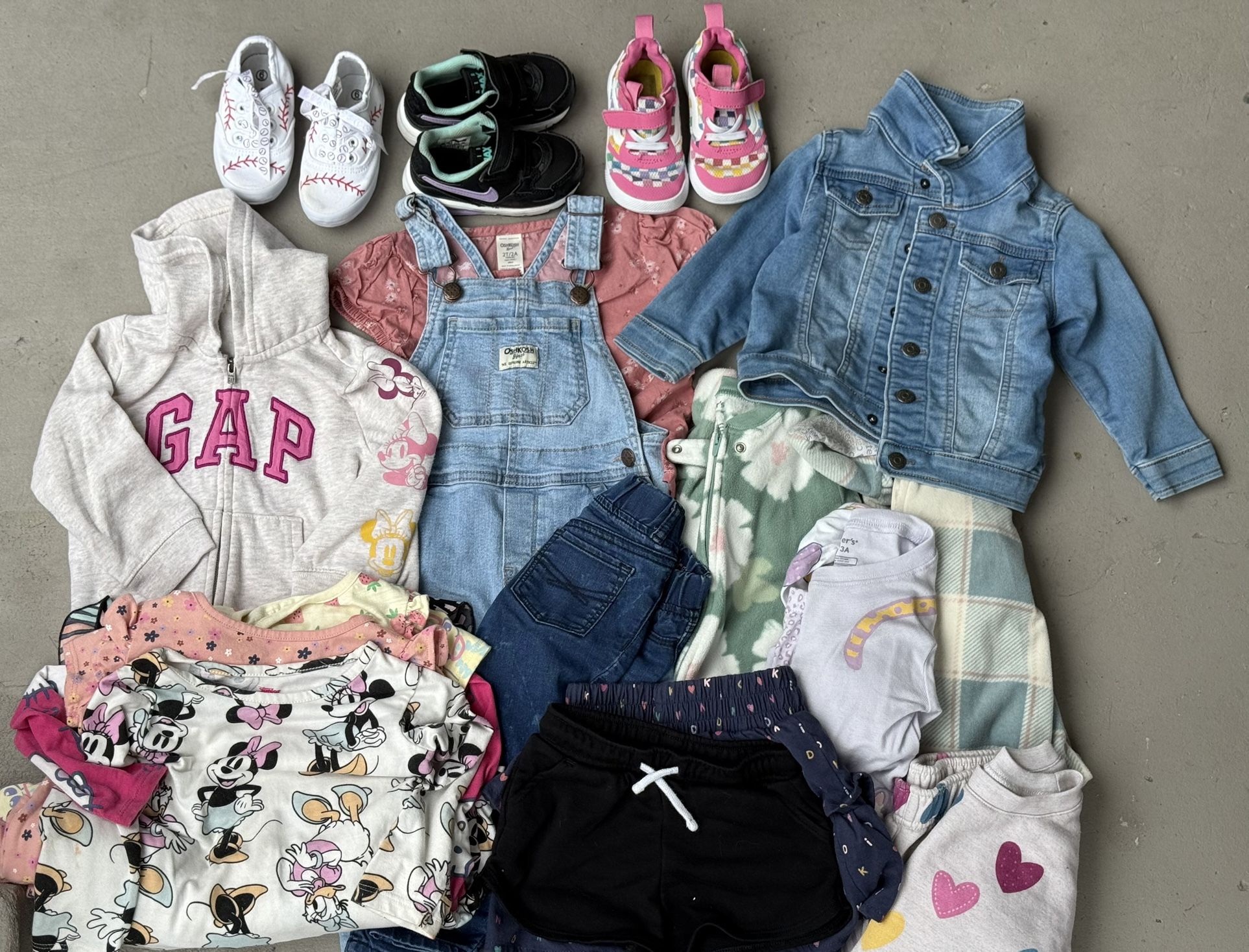Toddler 2t bundle. Shoe size 7c. Pink converse. Black/purple Nikes. Vans. Baseball canvas shoes. 2 footie sleepers. 1 3piece Jammie’s. 2 piece heart cozy top and bottom. 1 gap Minnie zip up. Denim Jean jacket. Oshkosh overalls, Oshkosh blouse. Dresses. Minnie, stitch, hello kitty and more. Shorts, leggings, and skorts. And more.