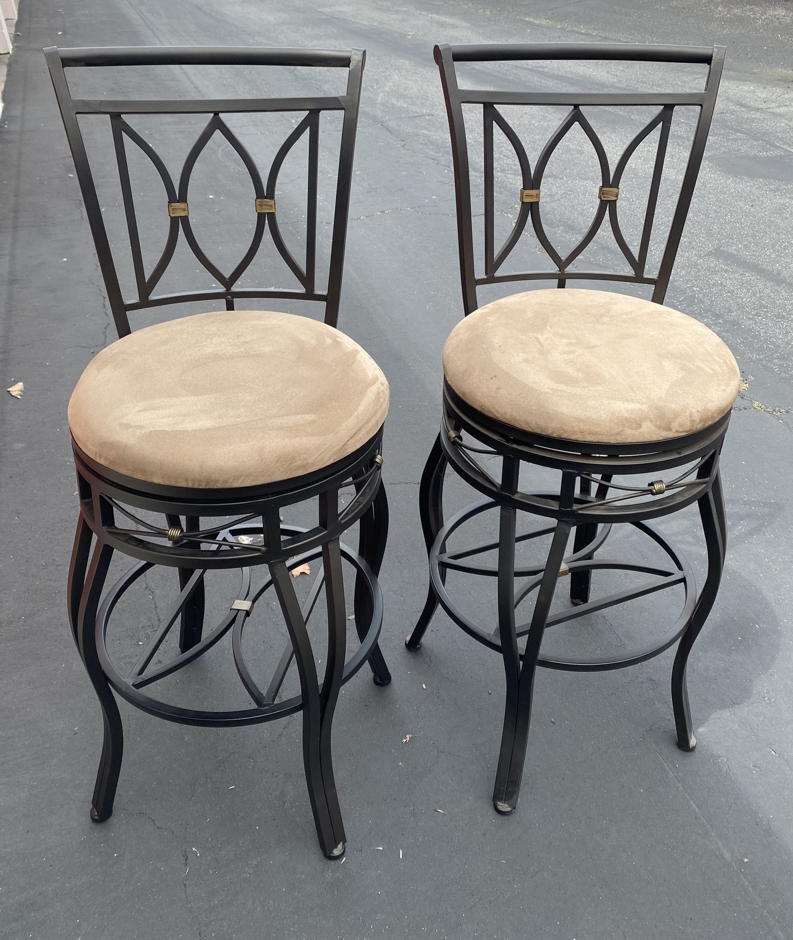 Selling 2 wrought iron bar stools with back support, suede swivel seat. 45” in height x 18” wide (seat). Condition is great, gently used with no scratches, like new. GARAGE SALE this weekend Hot item $200 each