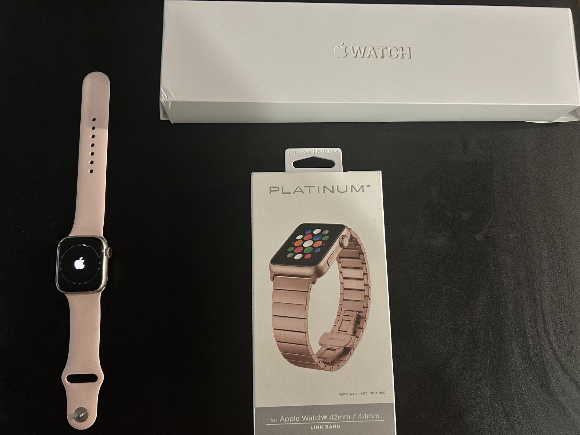 Great condition, fully reset no iCloud/activation lock. Comes with original box, wristband box. 97% battery life Starlight (silver) watch and rose gold band (M-XL bands available in box)
