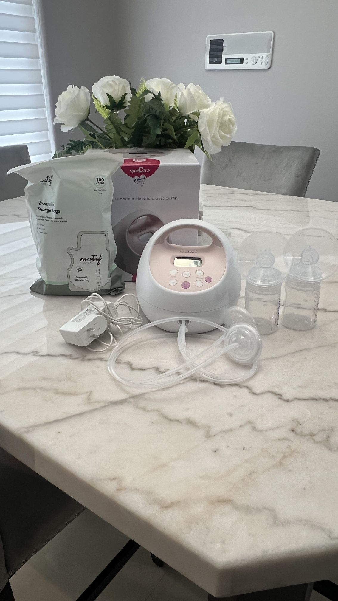 Spectra S2. Only used twice. 2 different size of flanges. No missing parts, all items in photo included. . Will also add 100 milk storage bags.