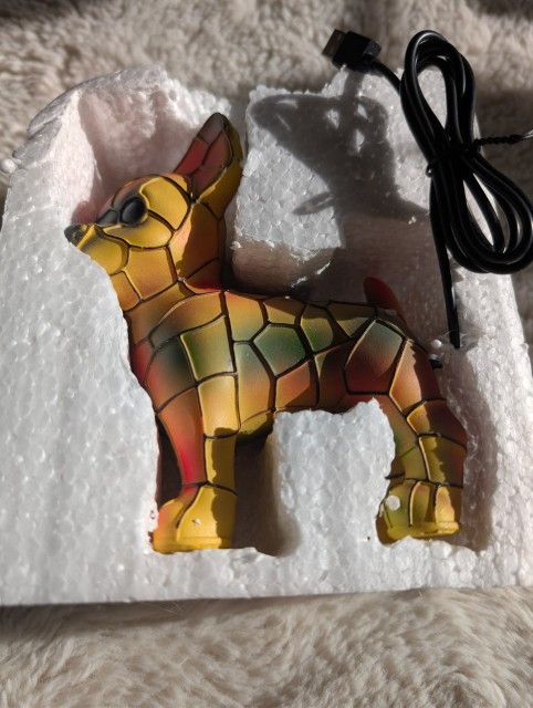Fun geometric dog USB lamp / night light. • Sculpted dog figure with mosaic-style panels in gold, green, red and orange • Plugs into any USB port (computer, power bank, USB wall adapter, etc.) • Great as a small desk light, night light or decor piece for bedroom, office or gaming setup • Includes USB cable and original foam packaging Condition: New/like new – never used, only taken out for photos.
