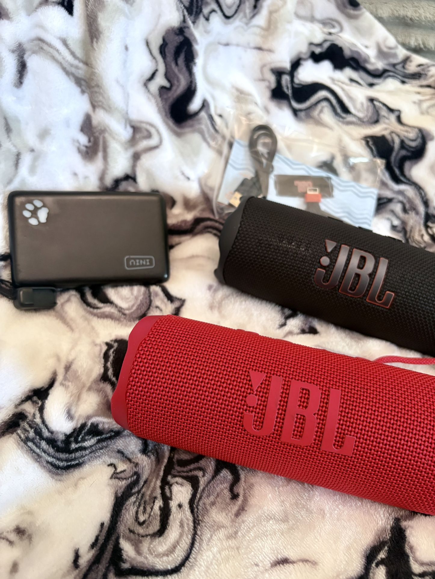 - $50 Red JBL Flip6 Used Speaker Has been used a handful of times and has normal shelf wear :) No original box or charger but in great condition otherwise! No physical damage and no sound quality issues. * - $100 Black JBL Flip7 Speaker Has never been actually used, it’s still brand new and I have the original box, charging cable, all that fun stuff. I took it out of the packaging just for display/selling purposes. * - $15 Black Portable Charger. It has a LONG battery life and it’s one of my life savers on the daily. No charging or connectivity issues or any of that just some normal wear I suppose it’s pretty evident in the pic but please feel free to DM me with any questions or requests for more pics or anything!