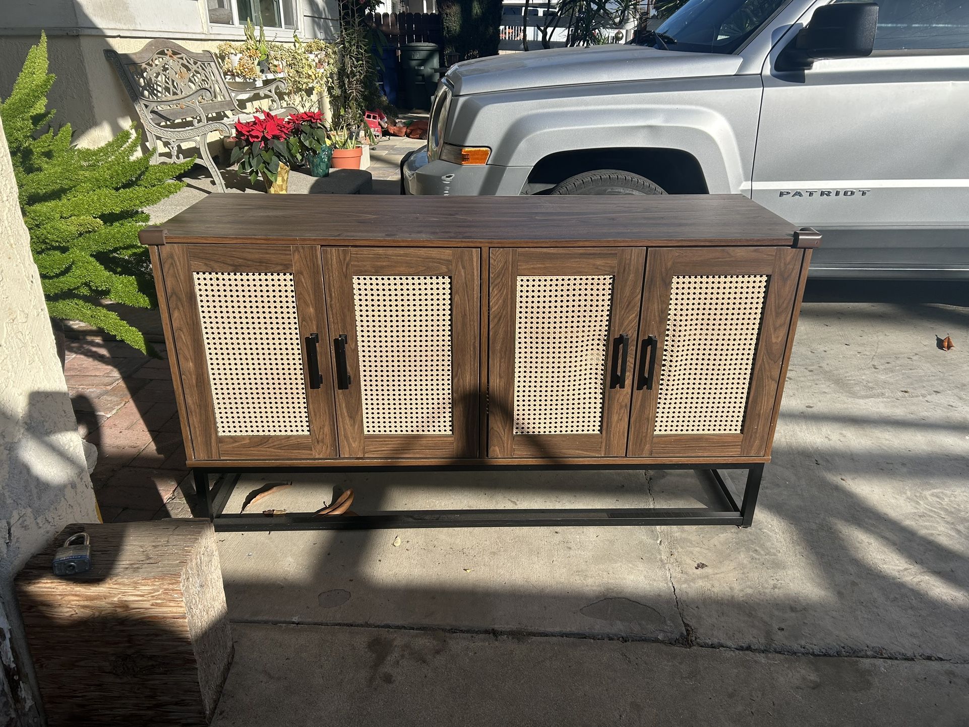 Beautiful walnut-finish TV stand with woven cane doors and black metal base. Stylish and sturdy with plenty of storage. Has normal wear and tear, could use a good cleaning, and there is a small dent on the front near the mesh, but it’s still very nice and fully functional. Dimensions: 56” L x 18” W x 30” H Pickup only. Message if interested!