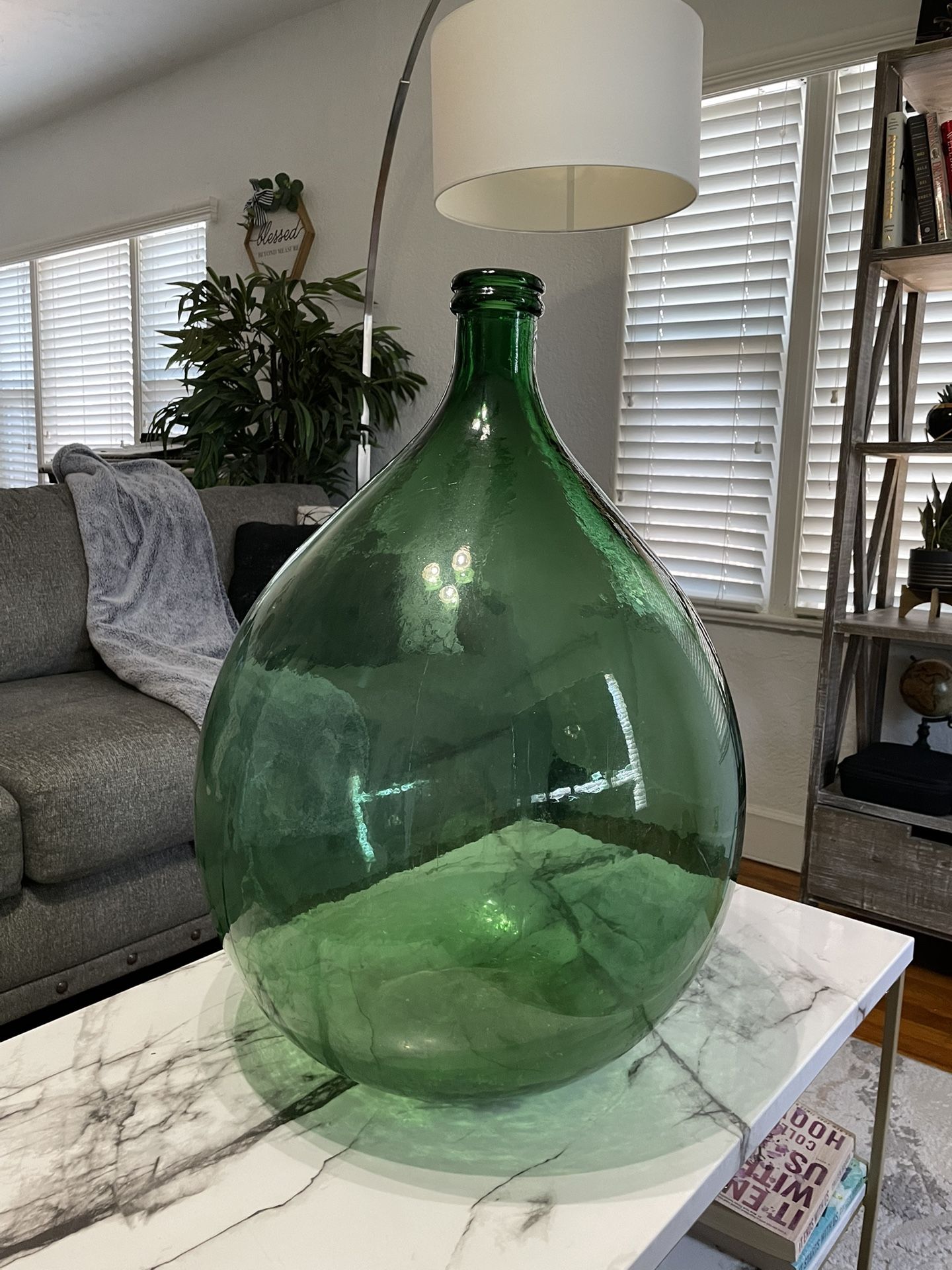 Giant Vintage Green Glass Demijohn, Giant wine Flagon, Big wine Bottle, Old Italian demijohn Dame Jeanne, modern antiques