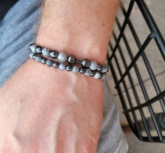 New set of bracelets, made of natural stones, a dumbbell also made of hematite, a strong elastic band. wrist size 19-20 cm 15$ for the bracelet