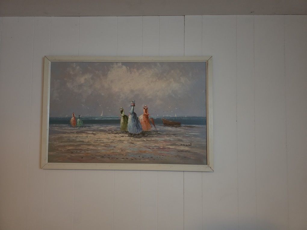 26 in tall x 39 in wide hand oil painted picture of women at the beach with a boat signed by Swan. No tears or stains. Just needs a new home!