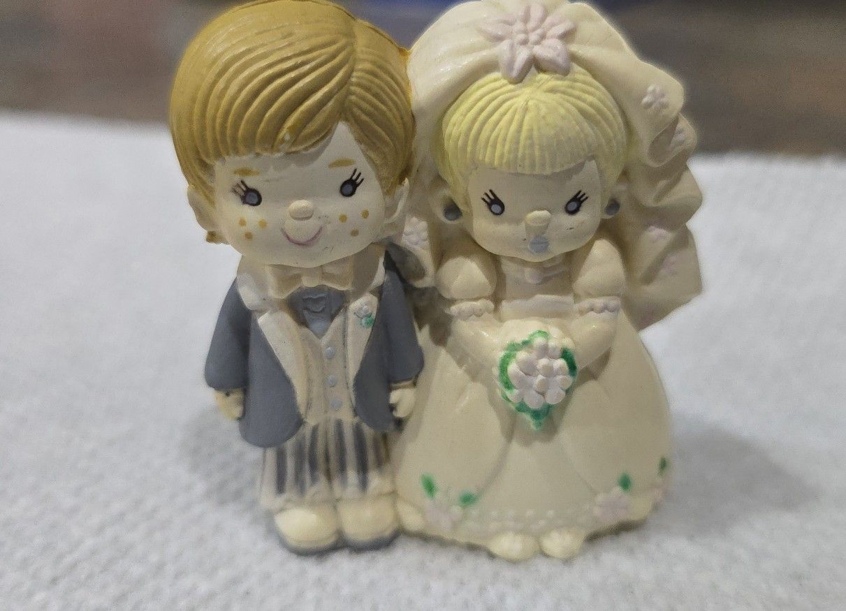 Vintage Precious Moments-style bride and groom wedding cake topper figurine. MINIATURE COLLECTIBLE The figurine is made of resin. Check photos for measurements in inches. It features the signature teardrop eyes and innocent expressions associated with Precious Moments collectibles. These items are often used as cake toppers or wedding keepsakes. The manufacturer is likely Enesco, as suggested by similar vintage listings. $10.00 CASH ONLY Gilbert and Guadalupe roads *Quarter is only for size comparison. It is not included.