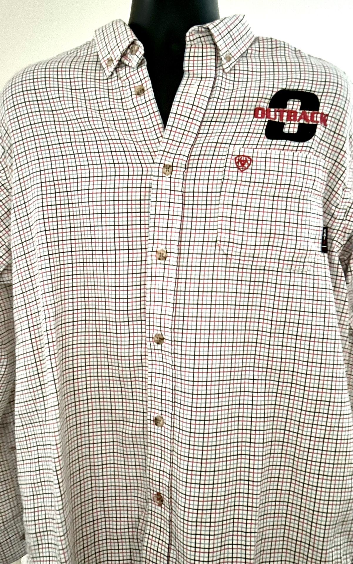 Ariat FR work shirt in a large size (L/G), featuring a red, white, and blue plaid pattern. The "FR" indicates the garment is flame-resistant, designed