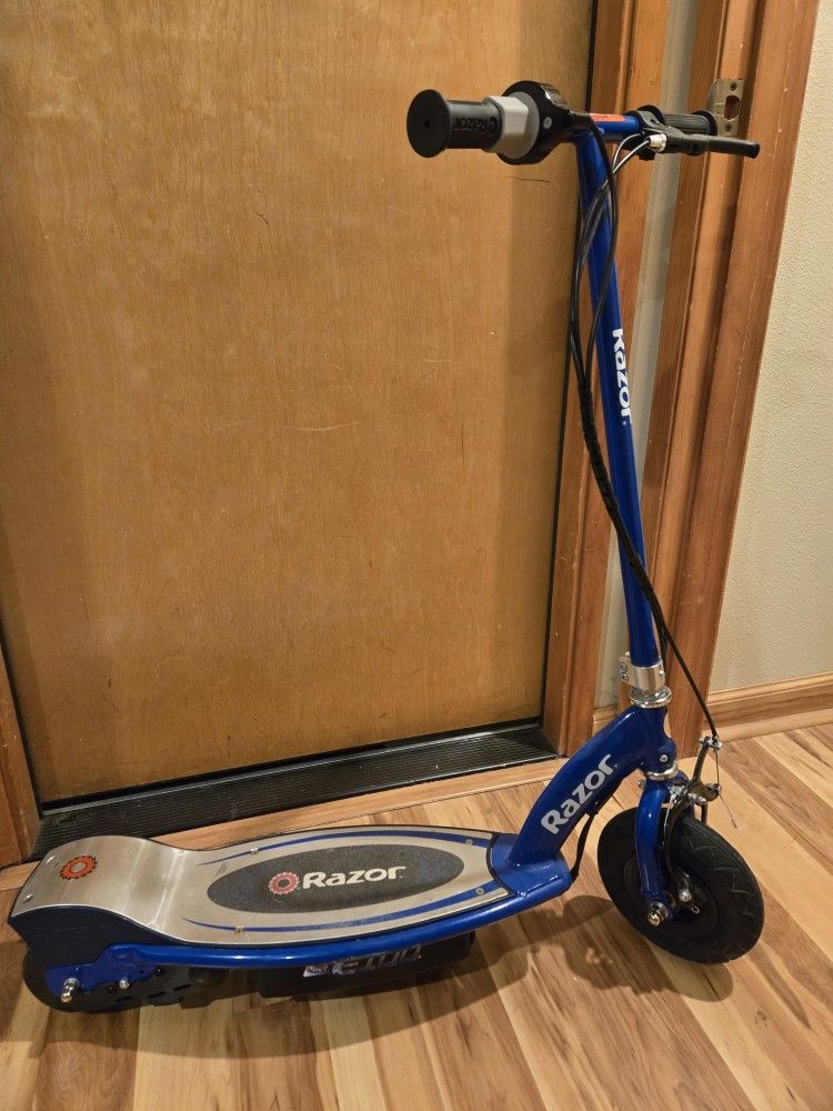 Razor E100 scooters, blue, $80. Only ridden a handful of times, always kept indoors. Batteries still charge/hold a charge. Has 100-watt, high-torque, single-speed, chain-driven motor that delivers speeds up to 10 mph (16 km/h). Weight limit of 120 pounds. Product Note: Max speed and range per charge vary based on several factors, including: rider weight, riding surface, incline, ambient temperature, battery level, riding style (stop/start vs cruising), etc