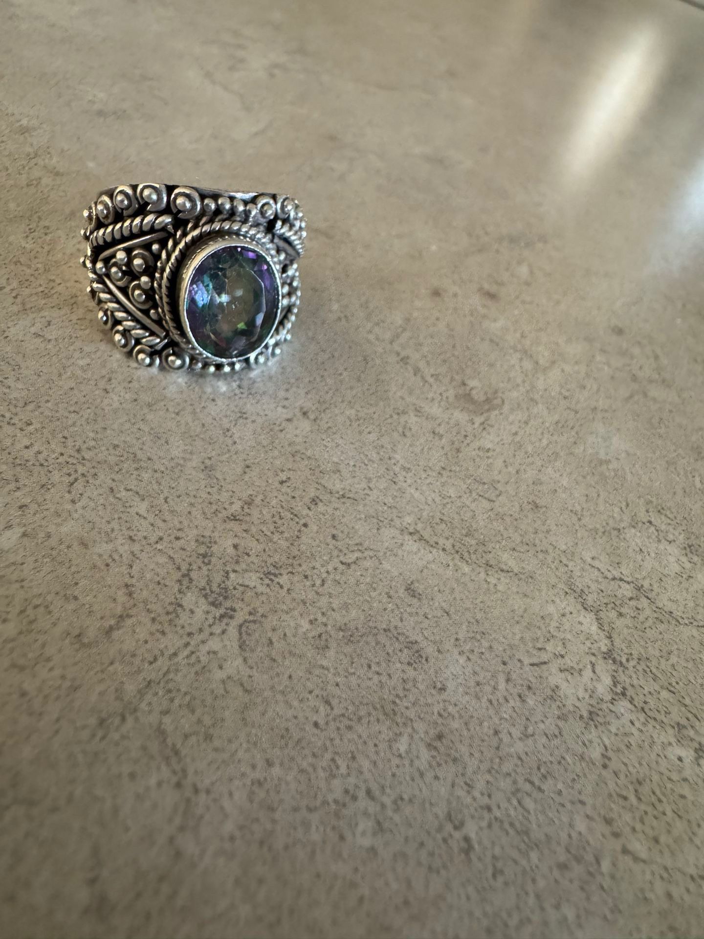 Pretty vintage sterling silver ring mystic stone size 6 . Is a little bent but can be easily adjusted