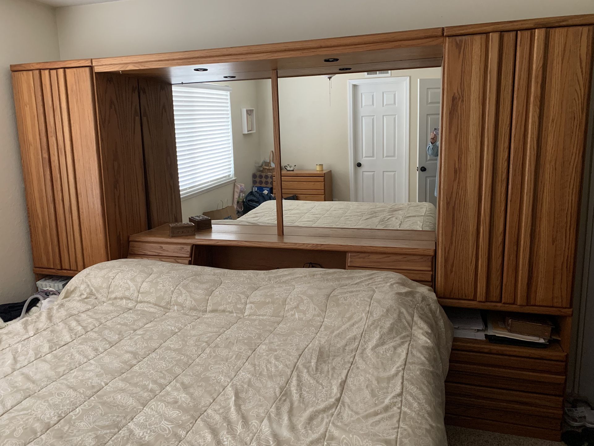 Mirrors, touch lights up on bar, 2 tall cabinets both sides with 2bottom drawers and pull out shelf. Oak. Good condition. Mattress not included.
