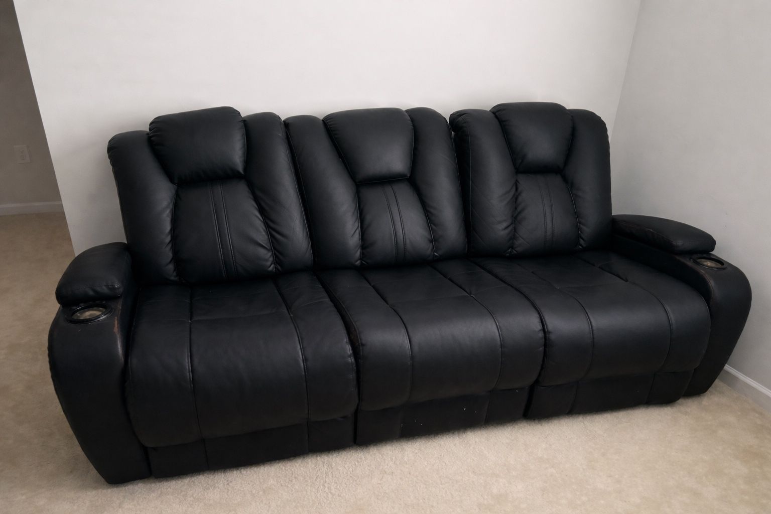 Comfortable black leather reclining sofa set in good, clean condition. Both sofas recline smoothly and feature built-in cup holders for a theater-style experience. No rips or structural damage.