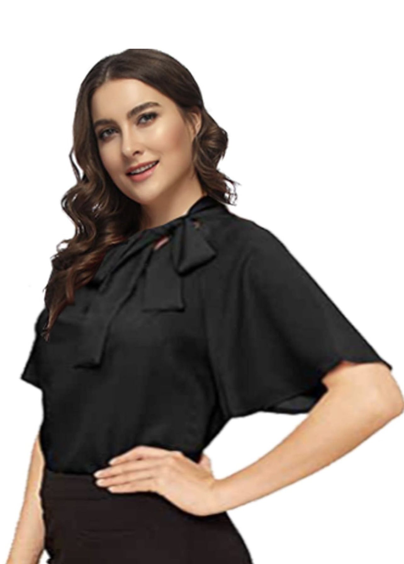 Womens Bow Tie Neck Short Sleeve Office Work Chiffon Blouse Shirts Black 22W/2XL