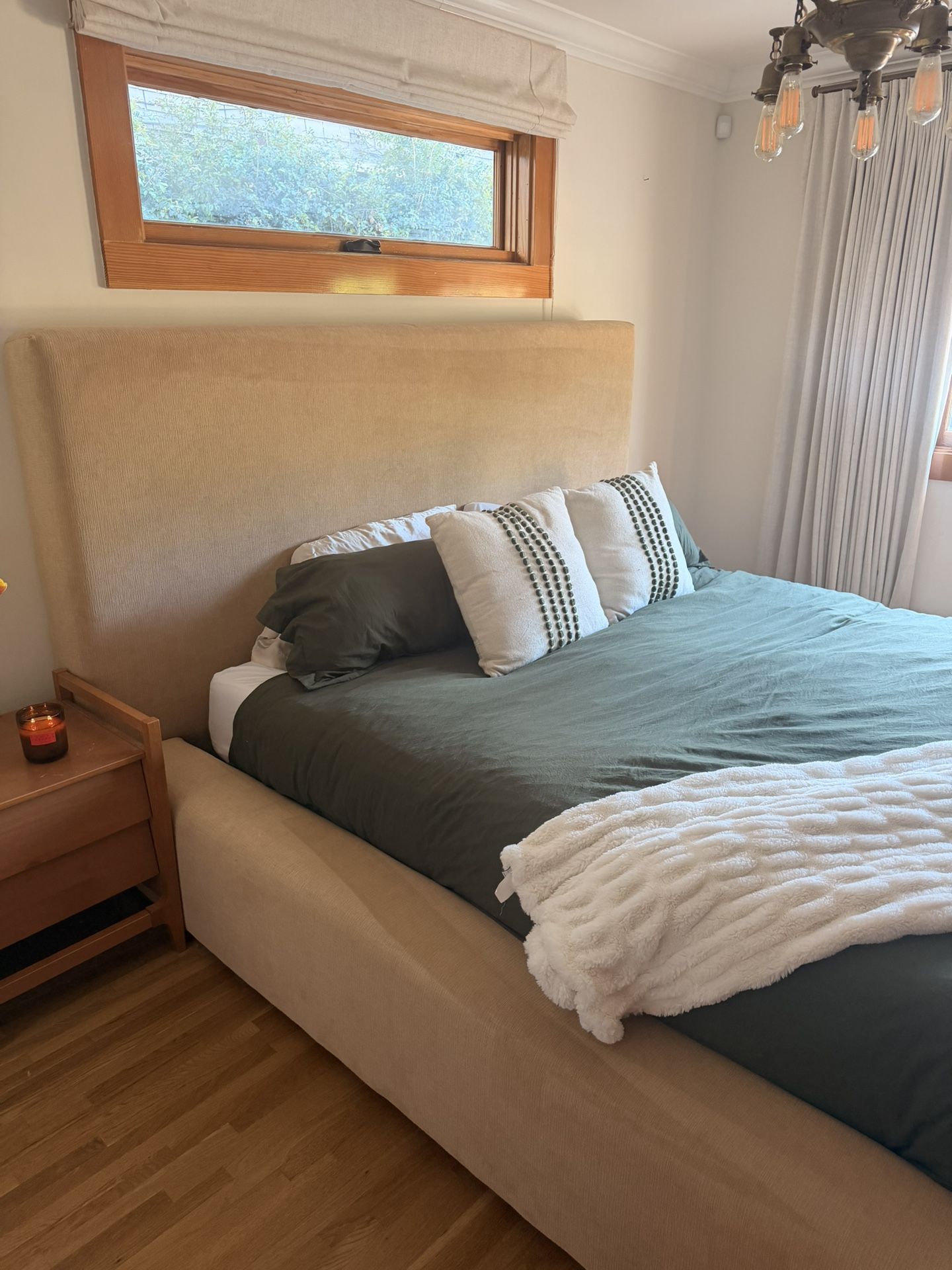 Selling our Porto Upholstered Platform Storage Bed in Heavenly Caramel fabric. The bed is in excellent condition and has been very well cared for. We love the design and built-in storage, but it’s too large for our room, so we’re downsizing from a California king to a king size bed. Details: • Size: California King • Fabric: Heavenly Caramel • Designer: Jeremiah Brent for Nate Berkus + Jeremiah Brent • Built-in storage drawer at the footboard • Platform design (no box spring needed) • Solid, sturdy construction • Clean modern upholstered headboard This bed retails for around $1,500–$1,800 new, so it’s a great chance to get a high-end designer bed for much less. 💡 Bundle Option: We’re also selling our California King Purple mattress. Buy the bed frame and mattress together for $900 total. Pickup only.