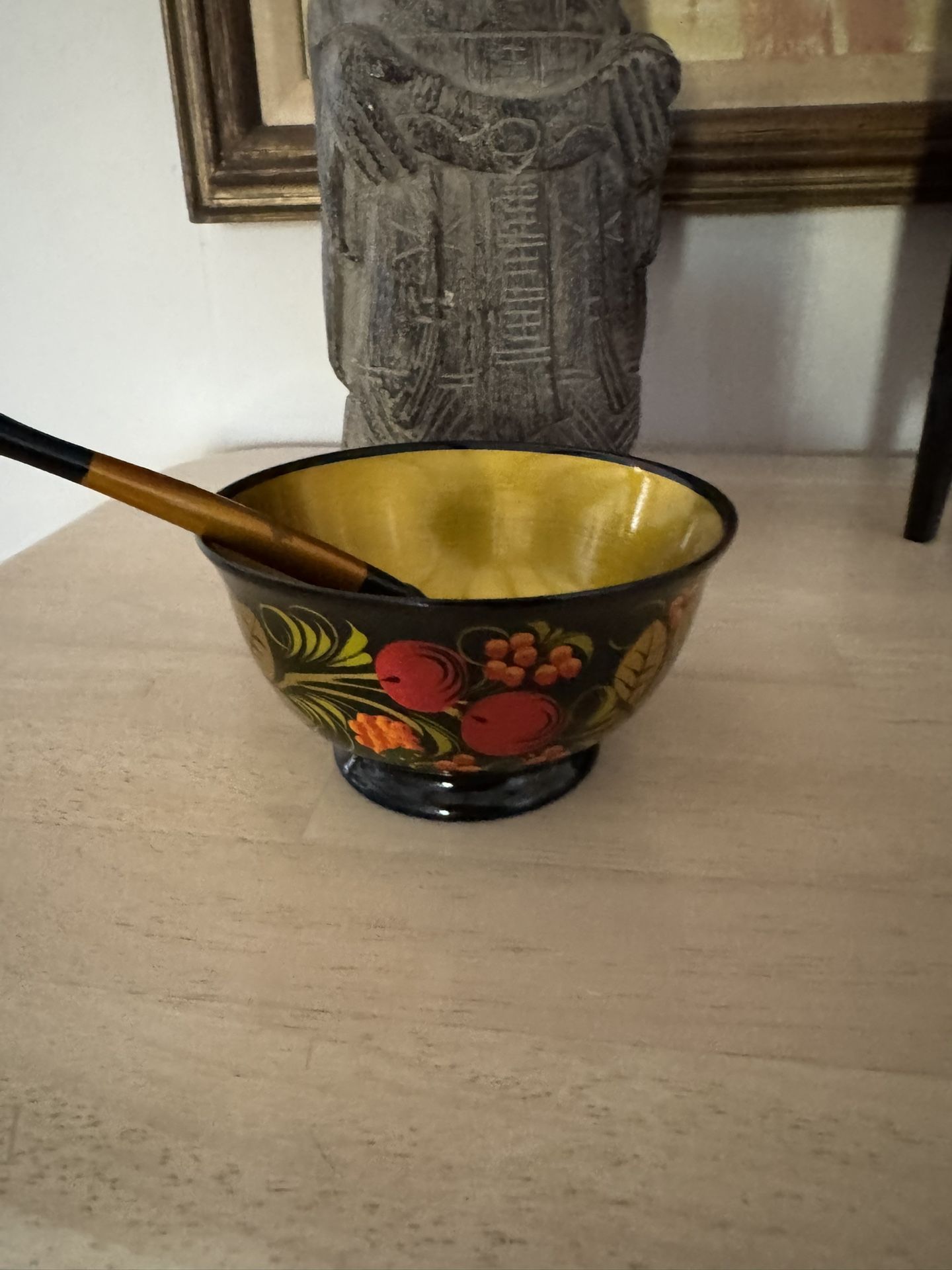 USSR Russia Lacquer Bowl & Spoon - Pattern on Black Lois