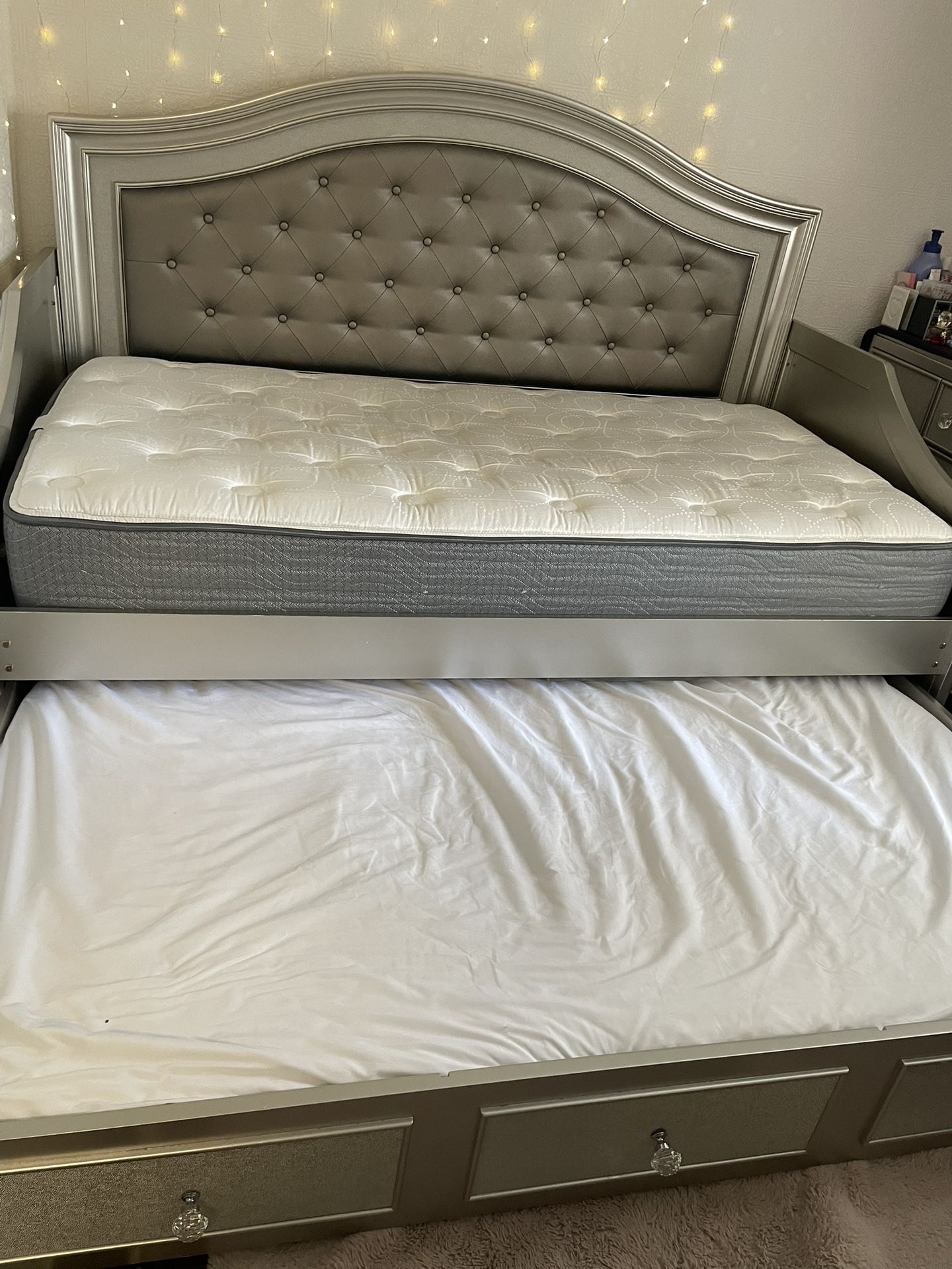 Beautiful Twin Bed (No mattress)in excellent condition Pullout drawer can be used to place another twin bed or used for storage Can come and see/view it for yourself without any compromise Asking for $380 or best offer You can make me a razonable offer In excellent condition