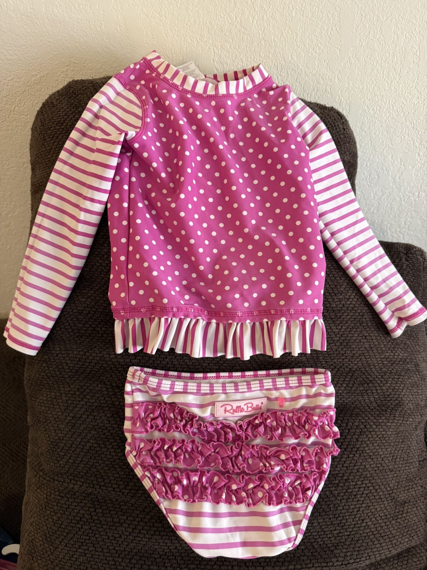 Girls toddler size 3T quality, gently used. Tiny spot of nail polish barely noticeable near the ruffles on the bottom piece. Longsleeve with uvb protection and for taking indoor swim classes this winter. $5