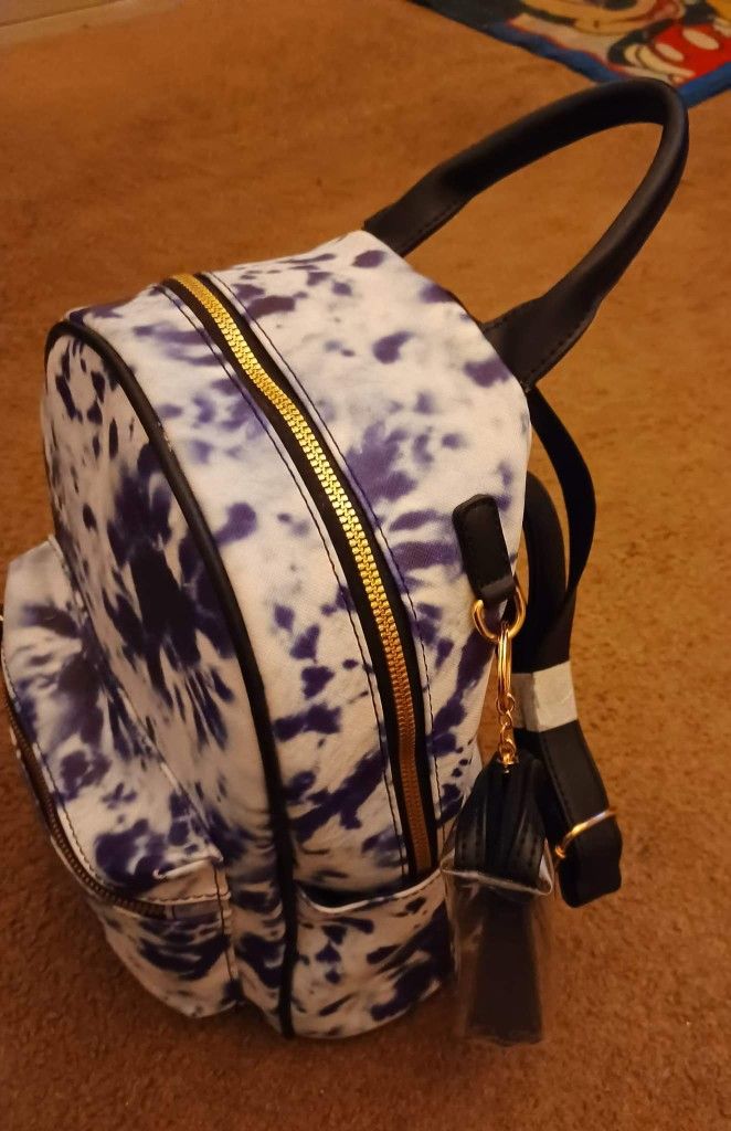 Ladies Backpack with change purse Being Kind Is Rad!! Tye-dye blue & white Zips in front for keys & small things. Big opening with pocket inside Mesa. Gilbert Rd and University