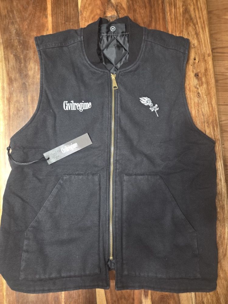 Civil Regimes Mens Black Zip-Up Vest. Size Medium with 2 front pocket and both logos beautifully embroidered on both sides of the chest. Comes Brand New with tags!!