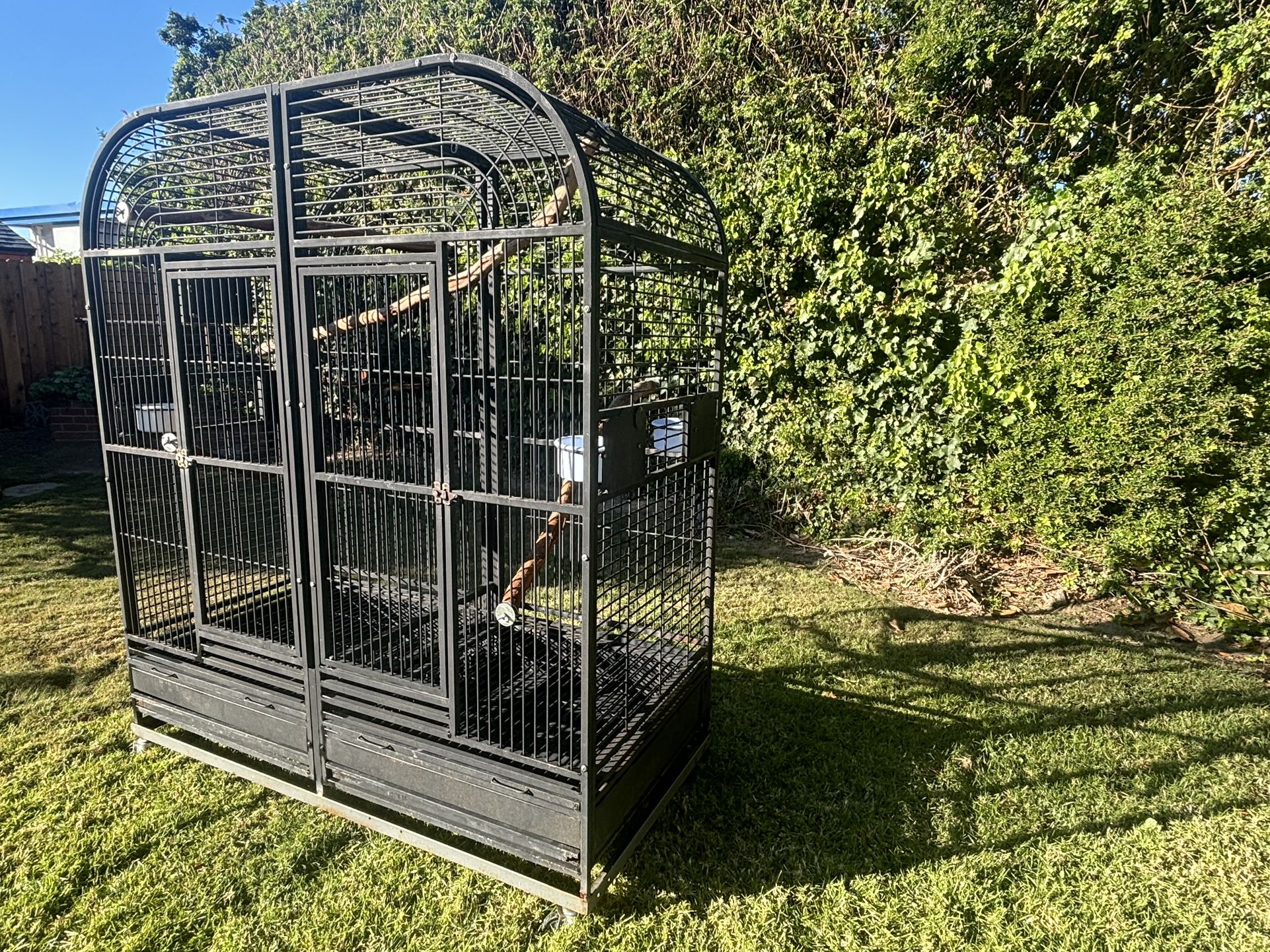Extra large bird cage. Includes 4 bowls and several natural branches. 64”w x 31 3/4”d x 73 1/2”h We do not have the insert to separate into two separate cages. We will deliver to SLO or Santa Barbara for an additional $75.