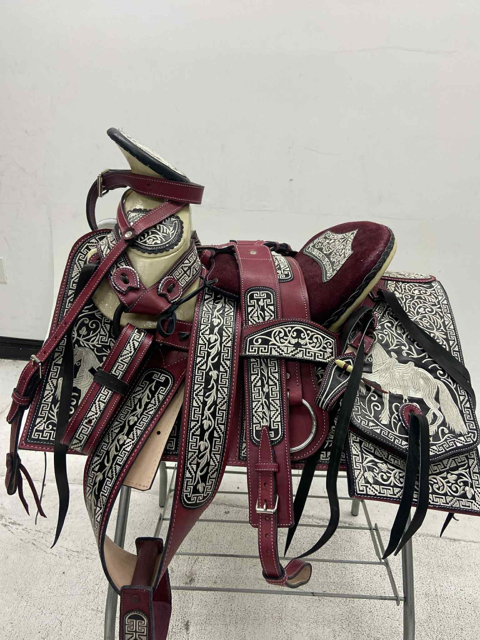 Hecha en México, 100% piel bordada con preciosos diseños charros exclusivos en toda la montura, el precio ya incluye la cabezada las correas para las espuelas, el cincho y la pechera, lista para recoger o entregamos a domicilio