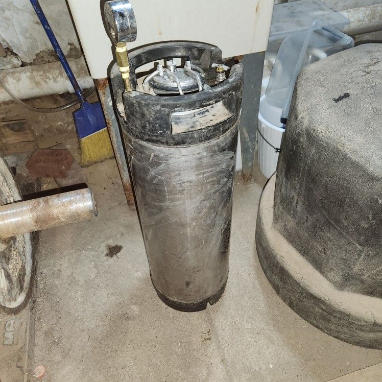 5gallon keg with pressure gauge ,used in good condition, definitely has some cosmetic wear and tear(scratches, rubber base worn ,nothing major. Out of service for years- I filled with water no leaks.
