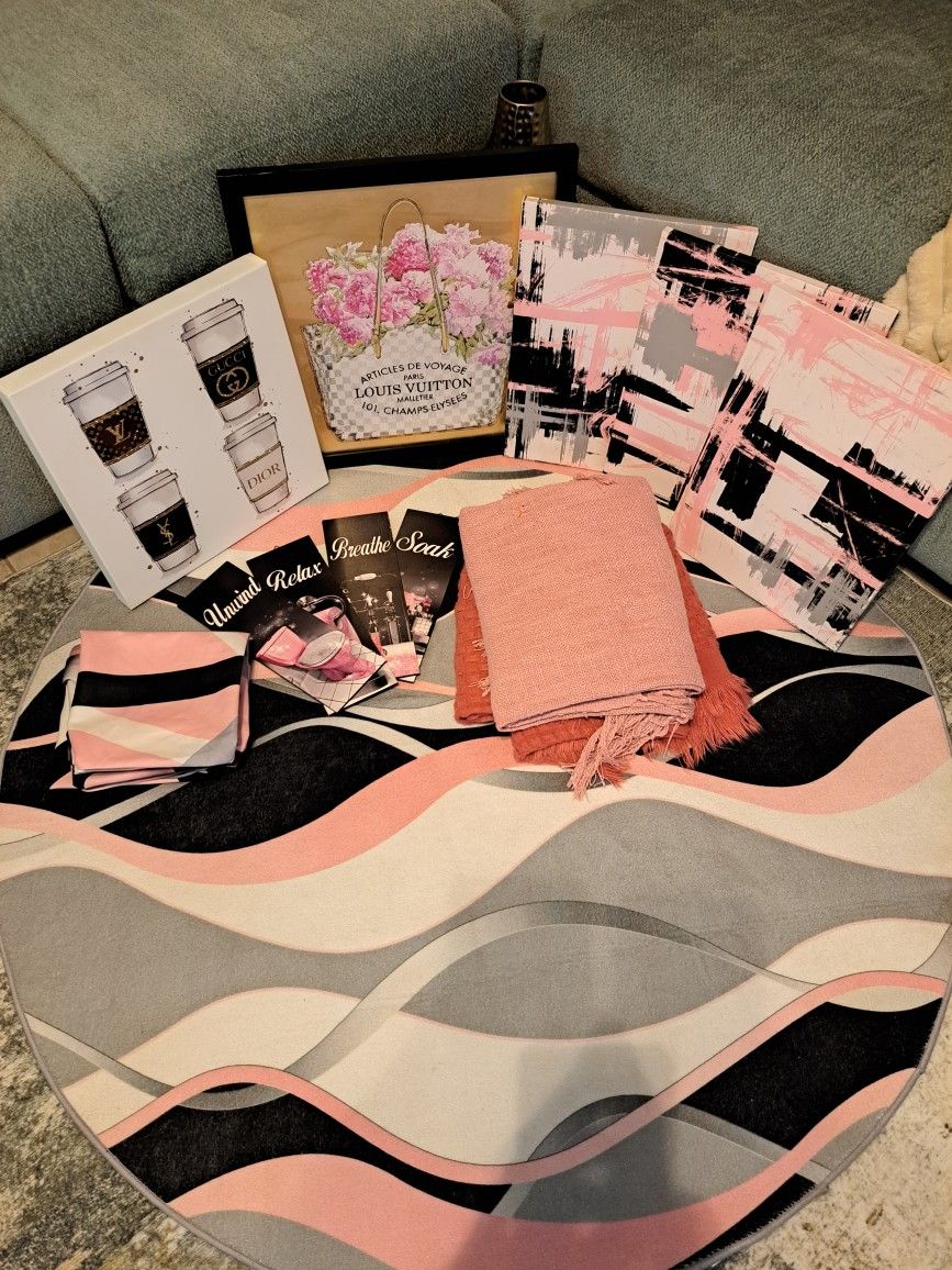 Home decor, Rug,4 small pillow covers,2 throws,4 bathroom pictures, and 5 pictures. Smoke free pet free home. No holds and No deliveries. As Is.