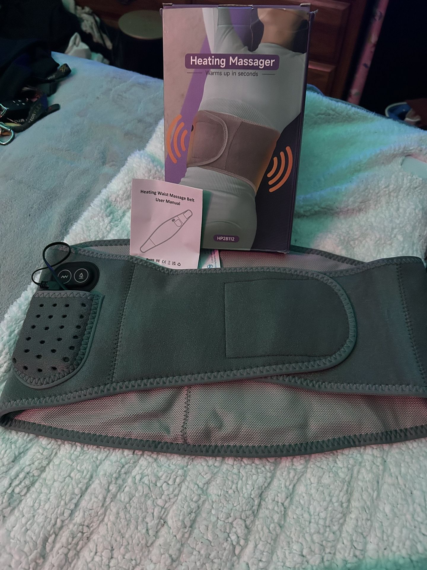 Brand new heating massage waist belt designed to help relieve lower back pain, cramps, and muscle soreness. Features heat therapy with vibration massage and an adjustable, comfortable fit. Cordless and easy to use at home or on the go. Includes belt, charging cable, user manual, and original box.