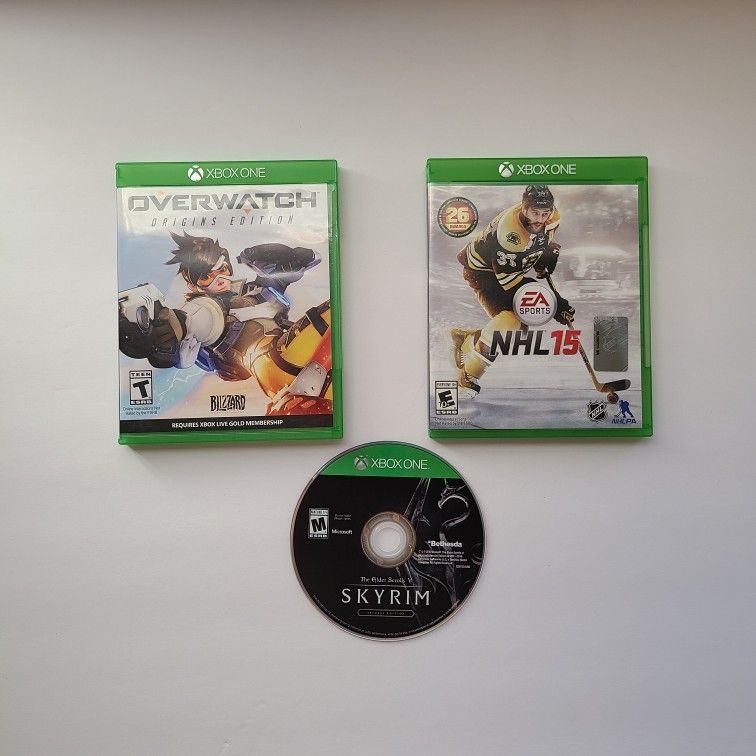 Overwatch, NHL 15, and Skyrim in great Pre-owned condition. Skyrim is missing case.