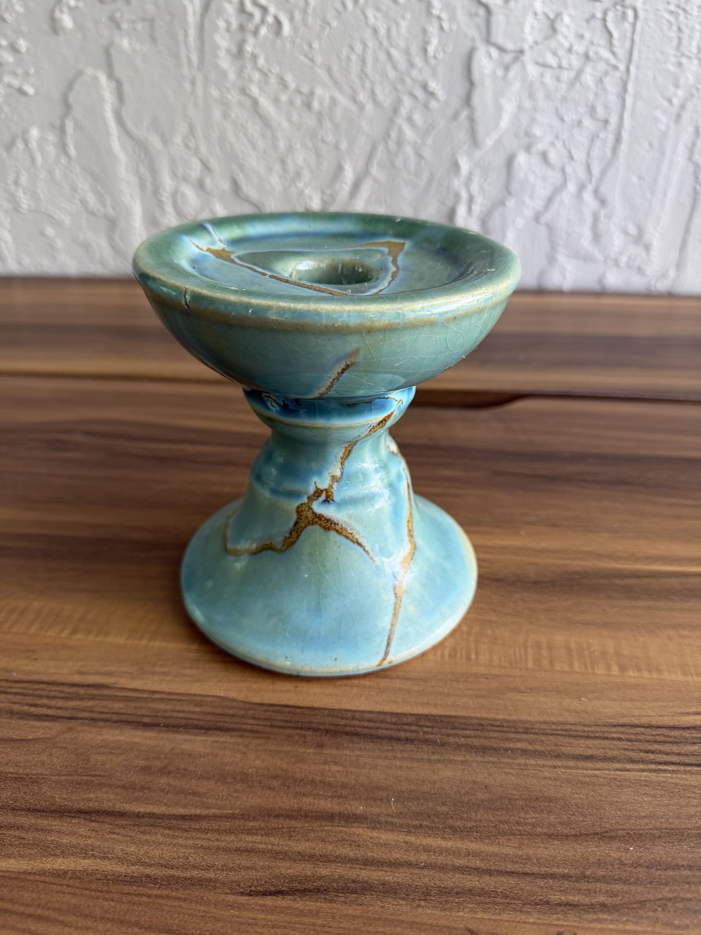 This unique ceramic pillar candle stand has a green and turquoise glaze. In excellent condition, no damage to the glaze. Measures 5 inches tall 4 1/2 inches wide. Would look great anywhere you decide to put it.