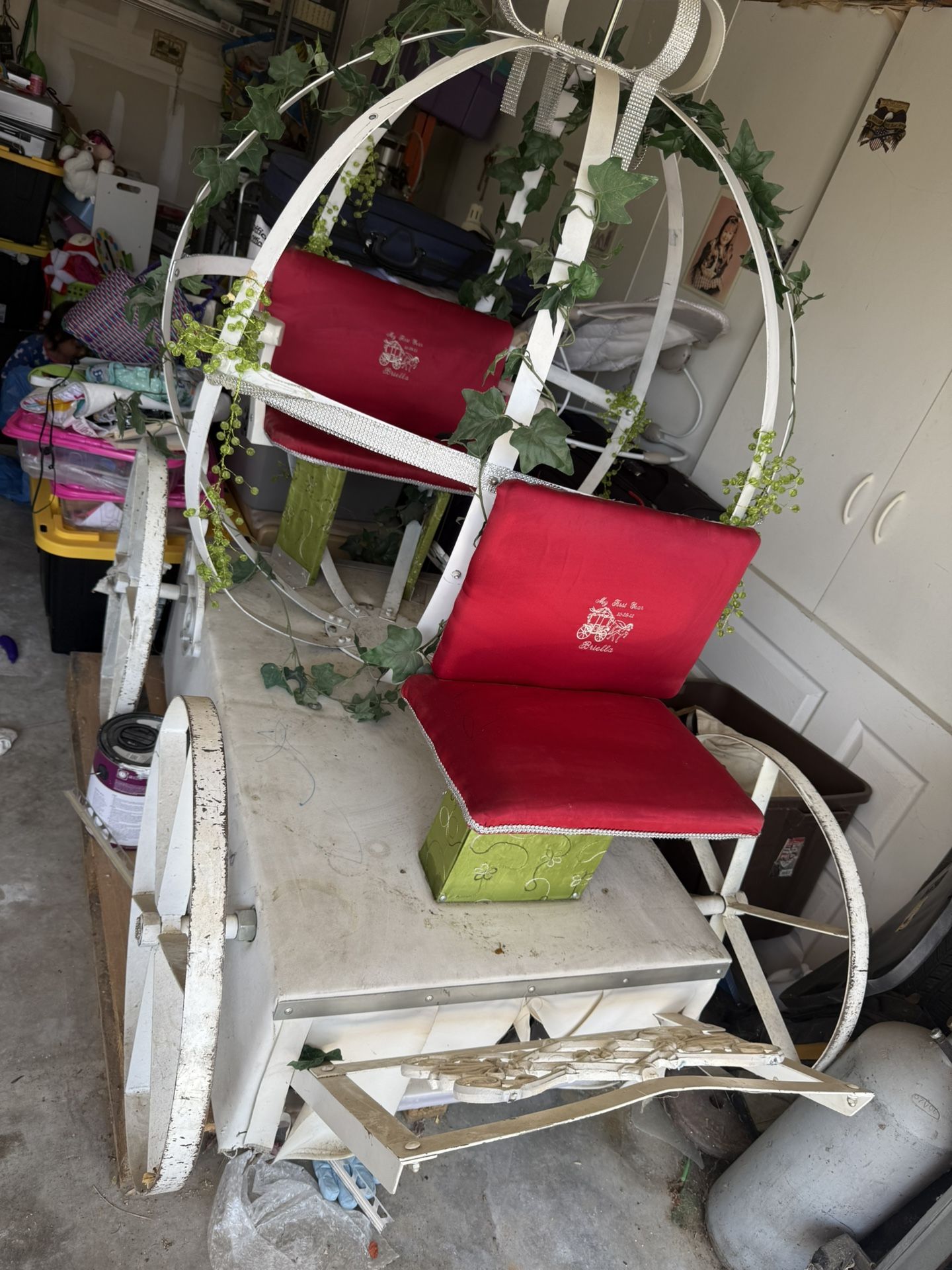 Carosa para cumpleaños. Se puede usar con caballo o solo porque tiene llantas. También se puede usar como mesa de pastel o postres. Está usada