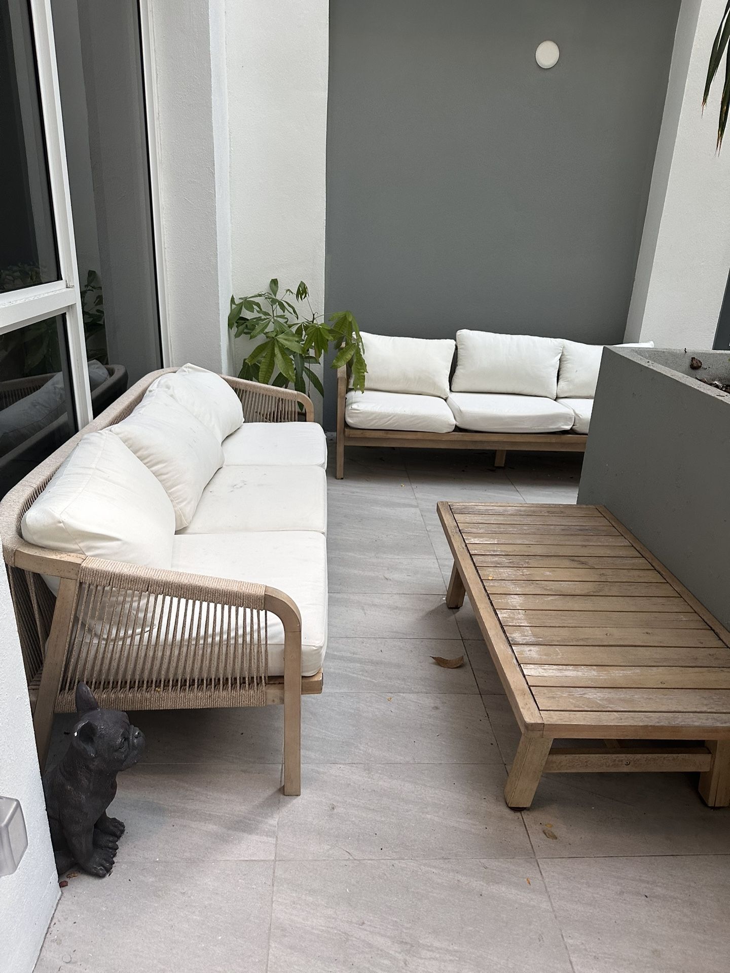 Modern Outdoor Patio Sofa + Chair Set — $950 🛋️ Contemporary Outdoor Patio Seating | Excellent Style & Comfort Selling a stylish two-piece outdoor patio set — perfect for a modern terrace, balcony, deck or backyard lounge area. Neutral tones and minimalist design make it easy to match with any outdoor décor. Includes: ✅ 2-seat outdoor sofa (long) ✅ 1-seat patio chair (single) (Coffee table available free if buyer wants, but sold as a set only — table is a bit worn.) ⸻ 🧵 Features & Highlights ✨ Contemporary modern aesthetic — clean lines + neutral cushions ✨ Light rope/wood frame (classic yet elevated look) ✨ Comfortable padded white/off-white cushions ✨ Great for social spaces, lounging, apartment patios, poolside ✨ Weather-resistant outdoor furniture ⸻ 📏 Approximate Dimensions 📏 2-Seat Sofa (Long): • Length: ~80″ • Depth/ Width: ~33½″ • Height from Seat: ~16″ 📏 1-Seat Chair: • Length/Width: ~27½″ • Depth/Width: ~33½″ • Height from Seat: ~16″ ⸻ 💲 Price ➡️ $950 OBO for the set (sofa + chair) 📦 Table included only if you want it — otherwise the set is priced as shown Original cost was around $1,750 - 2,000+ — great value at this price!